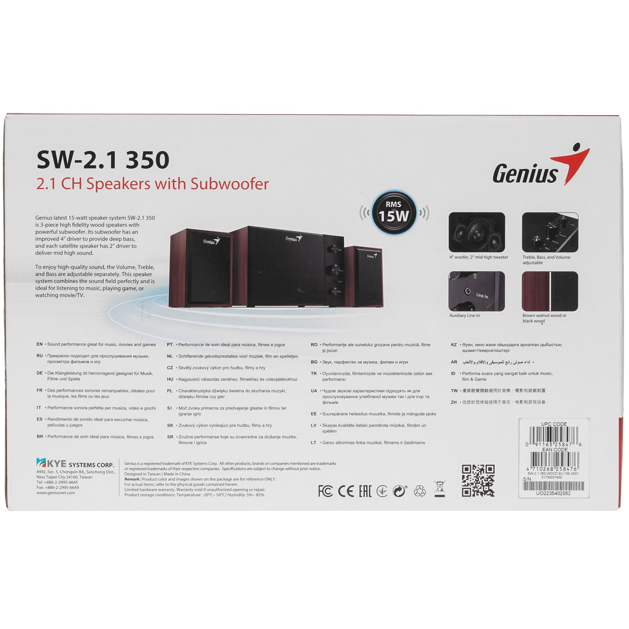 Питание Genius SW-2.1 350 осуществляется от сети напряжением 220 В. Подключение модели к необходимому устройству производится через выходы 3.5 Jack и RCA, а также линейный AUX-вход. Фазоинверторное акустическое оформление указывает на высокую громкость звука и легкость при выборе настроек. Панель управления находится на боковой стенке корпуса.