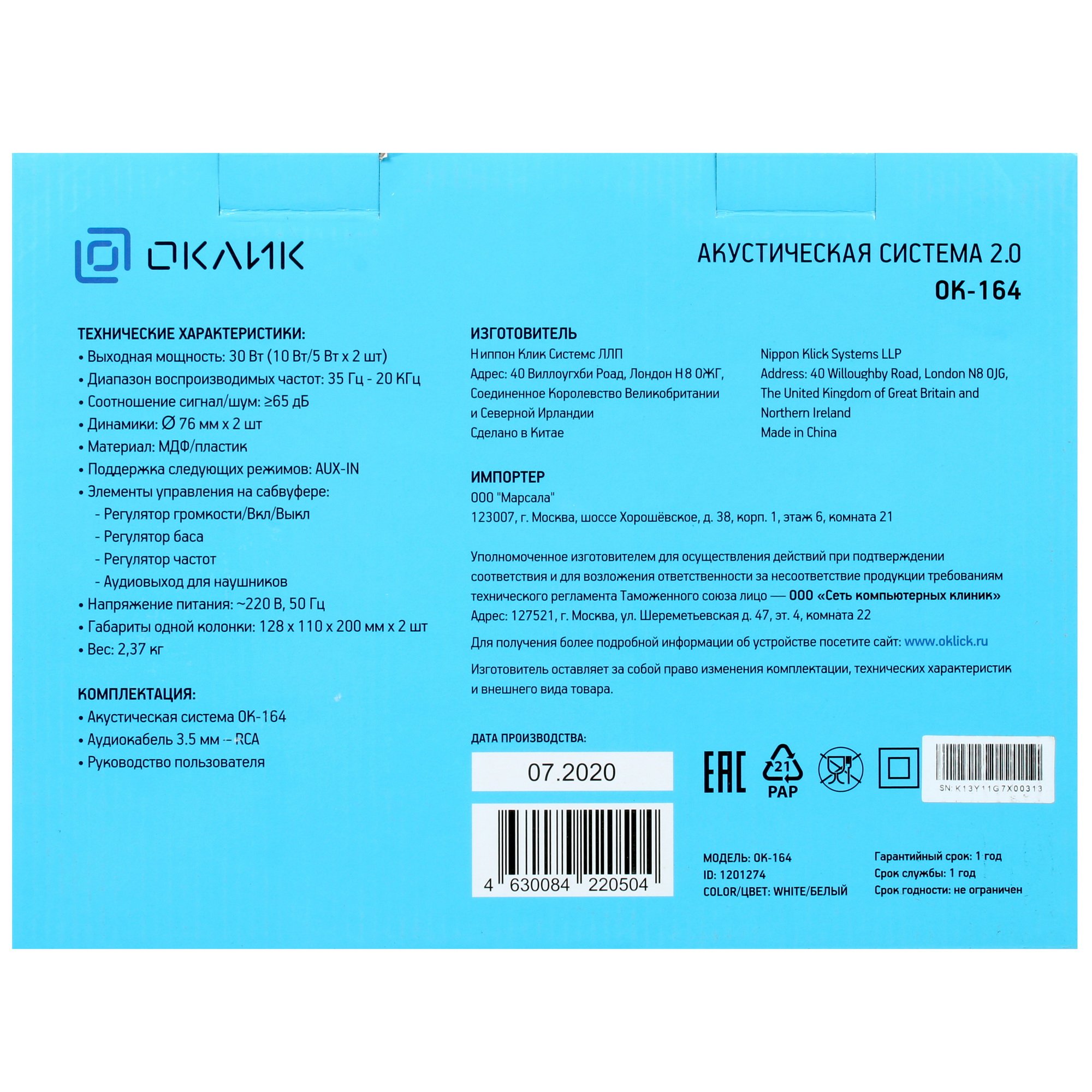 Акустическая система Oklick OK-164 2.0 белый 30Вт