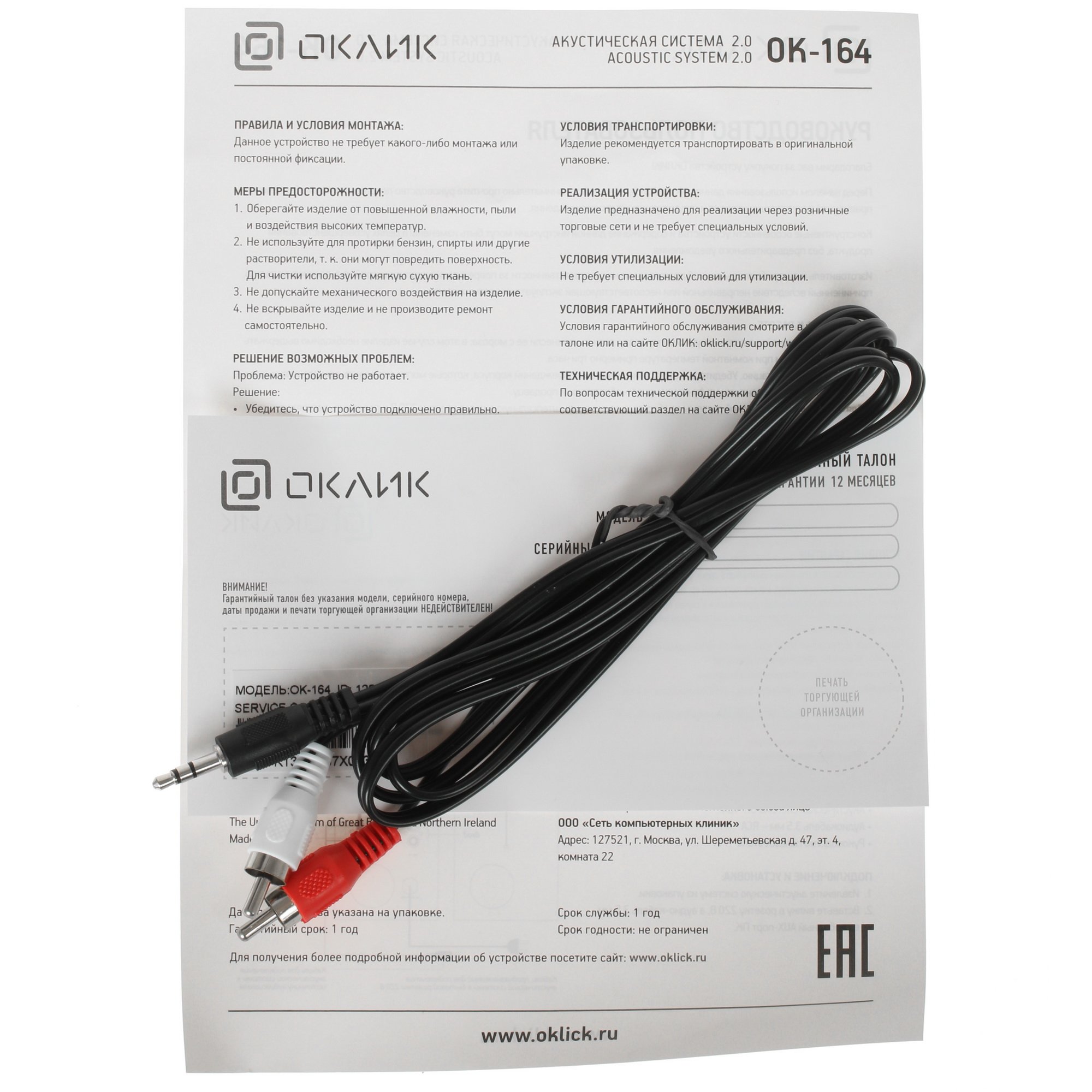 Система Oklick OK-164 работает с мощностью 2x15 Вт от стандартной сети на 220 В. Комплектация дополнена аудиокабелем. На корпусе имеется внешний регулятор громкости, выход для наушников и разъемы RCA, jack 3.5 mm. Также вы можете настраивать басы и высокие частоты.