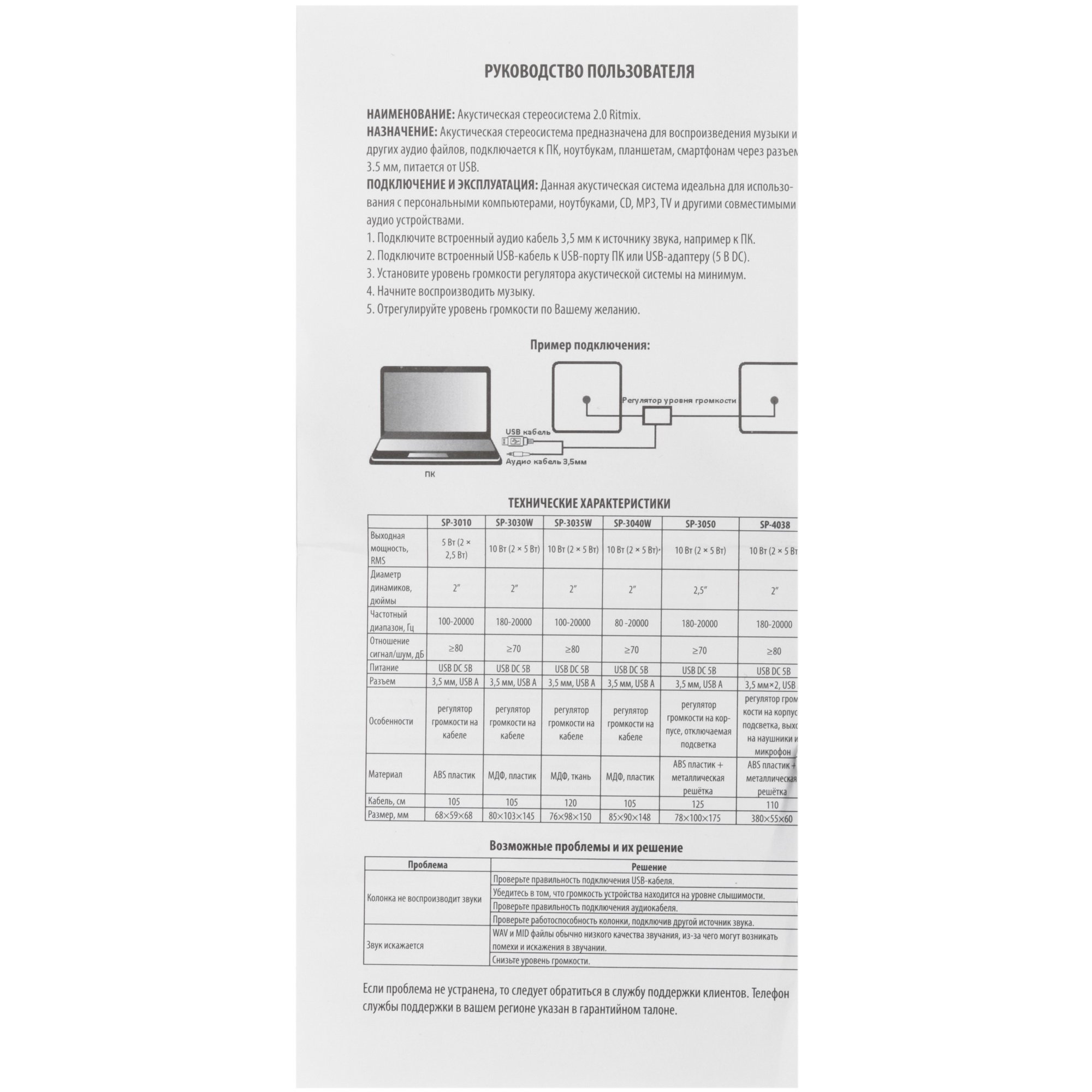 Компактные аудиоколонки RITMIX SP-3030W с выходной мощностью RMS 10 Вт (по 5 Вт на каждый динамик) дарят чистое и богатое звучание. Диаметр динамиков 2 дюйма обеспечивает отличную передачу низких и средних частот. Диапазон воспроизведения звука от 180 до 20 000 Гц позволяет наслаждаться музыкальными композициями с высокой детализацией и объемностью, а отношение сигнал/шум ≥70 дБ гарантирует минимальные искажения и чистоту звучания. Питание осуществляется через USB-порт, что делает их удобными для использования с компьютерами, ноутбуками и другими совместимыми устройствами. Встроенный регулятор громкости на кабеле позволяет легко настроить уровень звука под любые условия прослушивания. Для универсальности подключения предусмотрен проводной интерфейс 3.5 мм. Корпус изготовлен из МДФ и прочного пластика, что обеспечивает долговечность, легкость и стабильное качество звучания. Компактный и минималистичный дизайн делает эти колонки отличным дополнением к рабочему месту или домашней зоне для отдыха, создавая приятную атмосферу для прослушивания музыки.