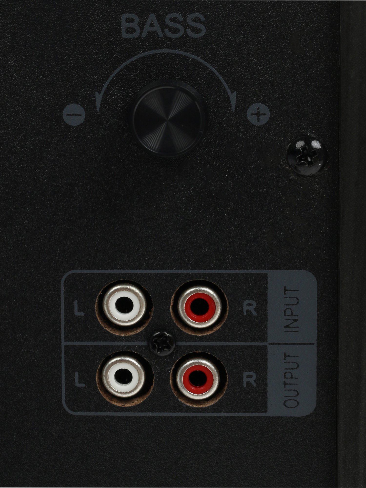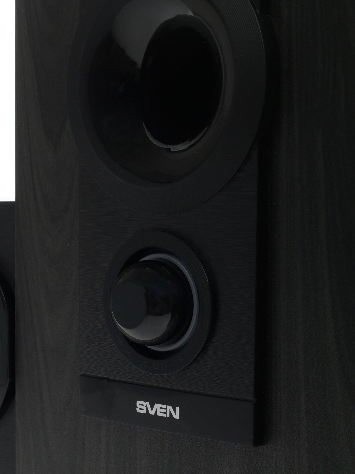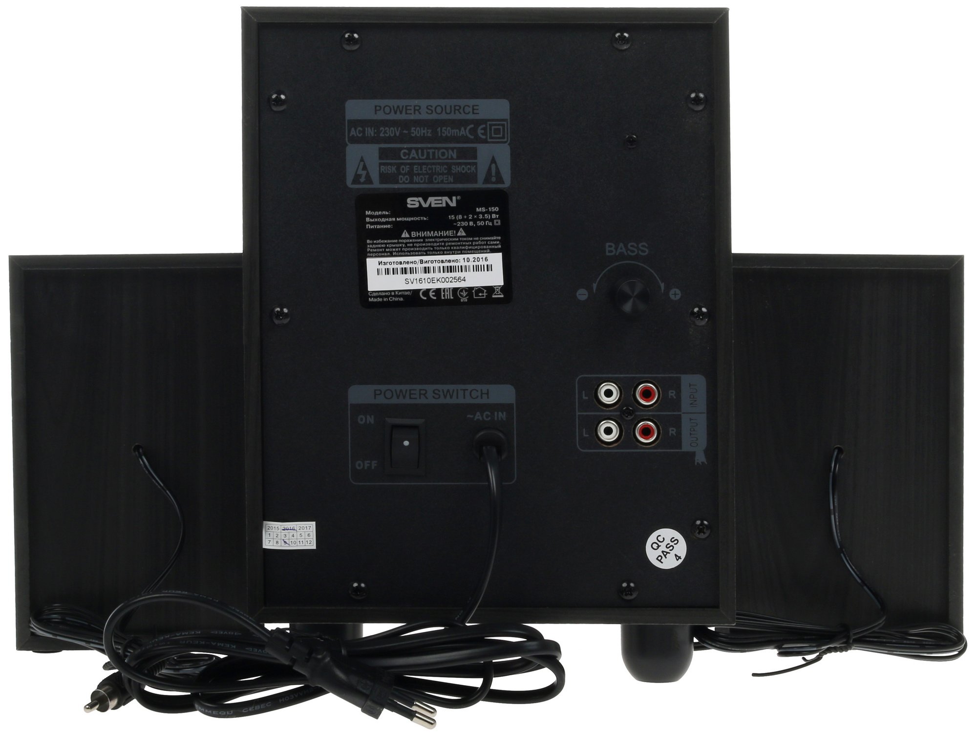 Колонки SVEN MS-150 подключаются к источникам звука с помощью разъемов RCA. Модель может подключаться к мобильным и стационарным компьютерам, бытовой аудиотехнике, аудиоплеерам и другим устройствам. На тыльной стороне сабвуфера, помимо кнопки питания, расположен регулятор басов. К регулятору громкости организован более простой доступ: он расположен на передней панели сабвуфера. Этот регулятор имеет стильную светодиодную подсветку.