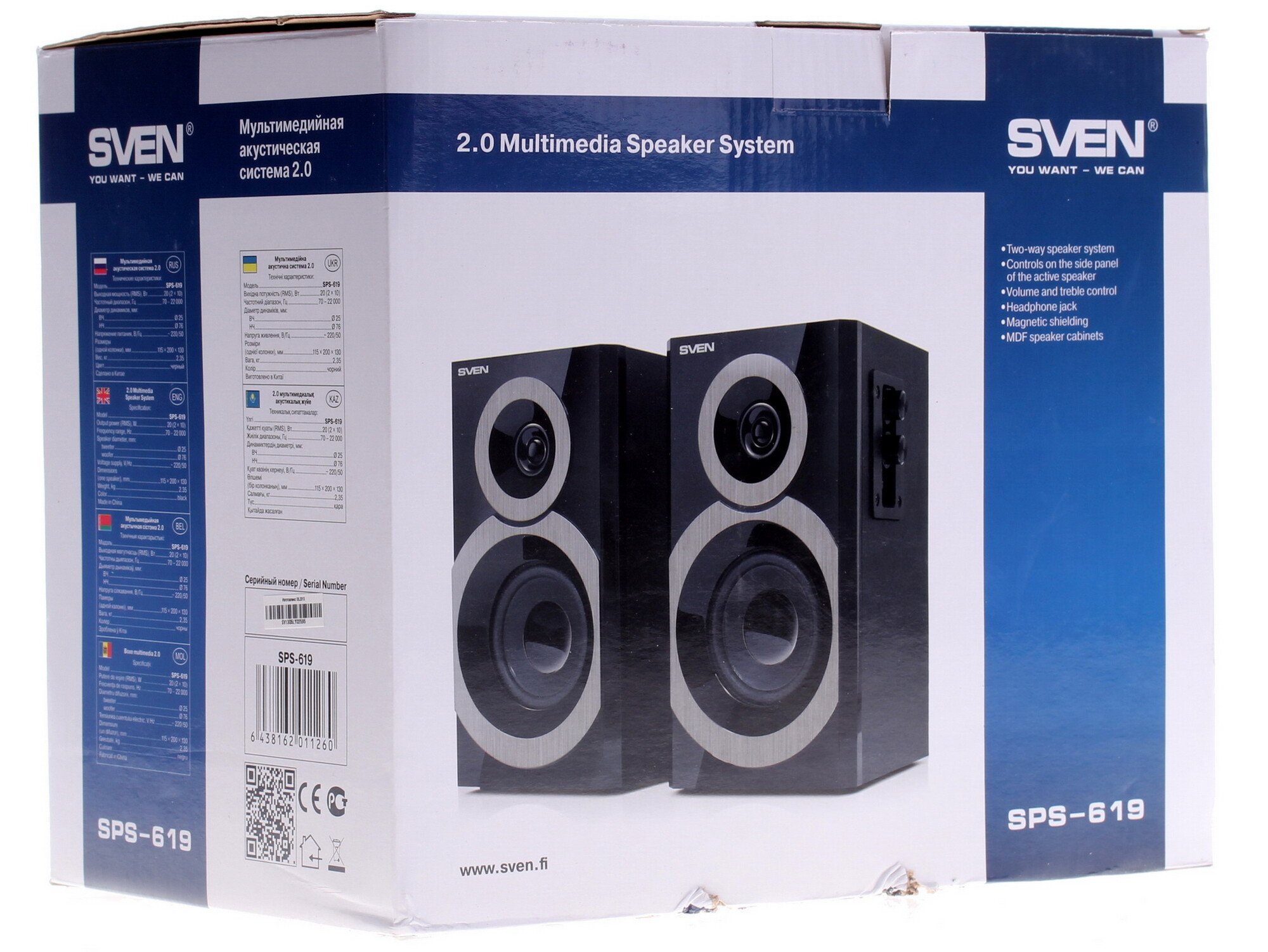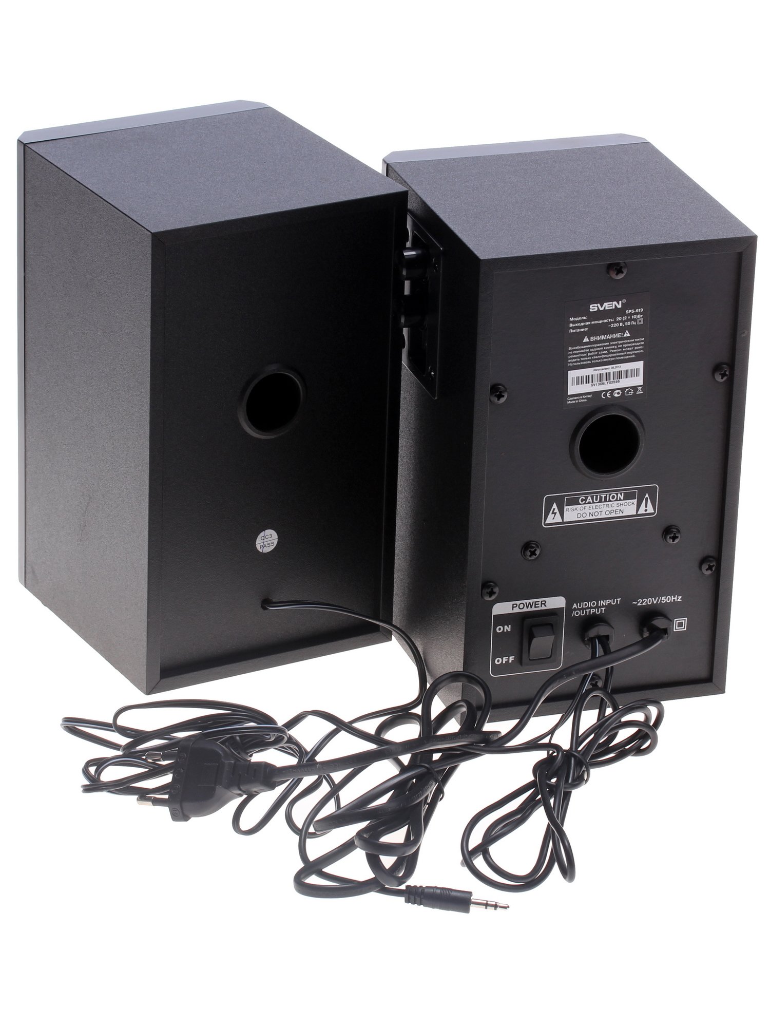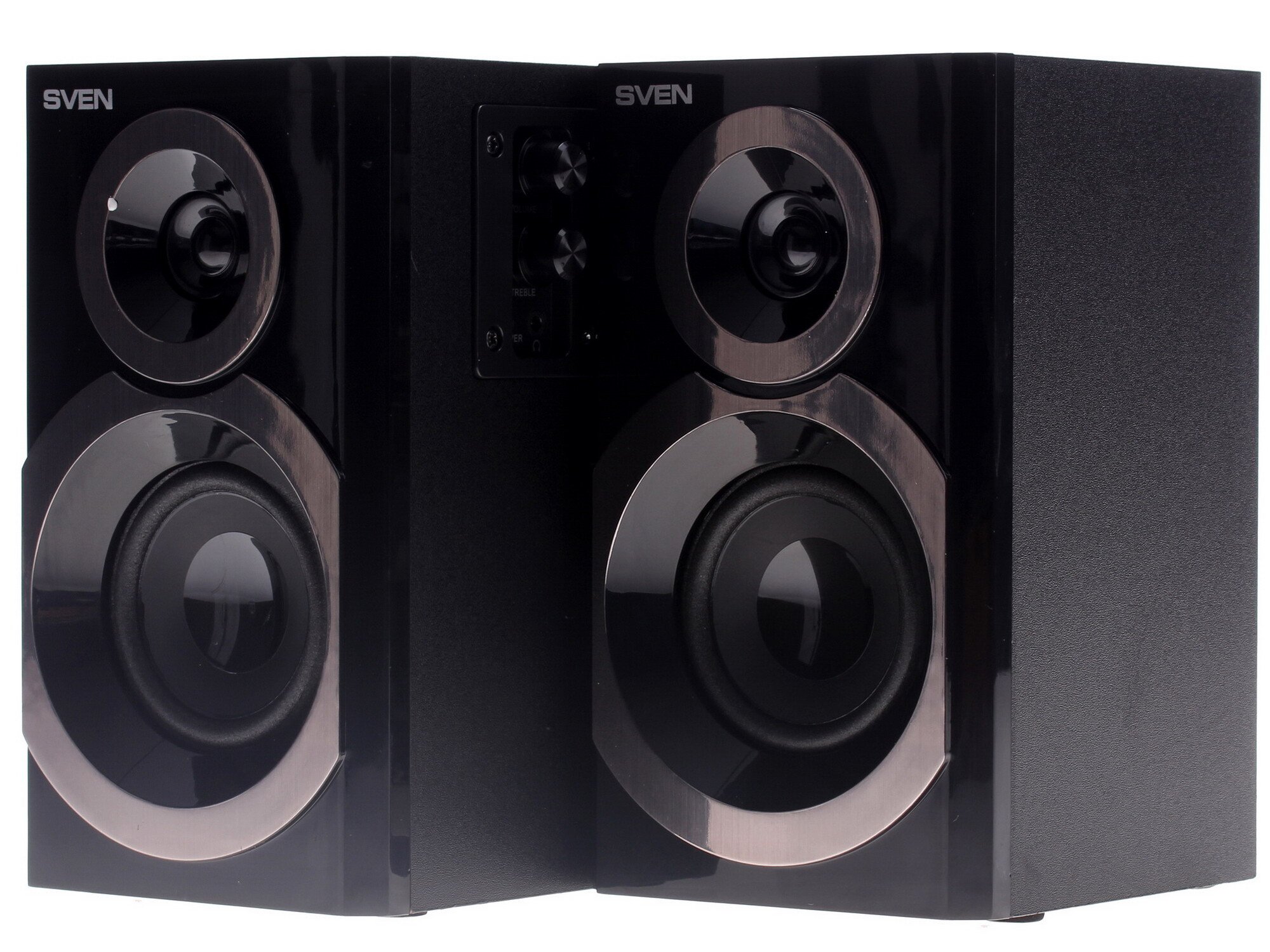 Чистота звука достигается разделением диапазона на частоты, за которые отвечает высокочастотный динамик малого диаметра и основной динамик, воспроизводящий низкие и средние частоты. Громкость высоких частот регулируется отдельно. Общая мощность системы SVEN SPS-619 составляет 20 Вт. Есть выход на наушники. Питание колонки получают от сети 220 В.