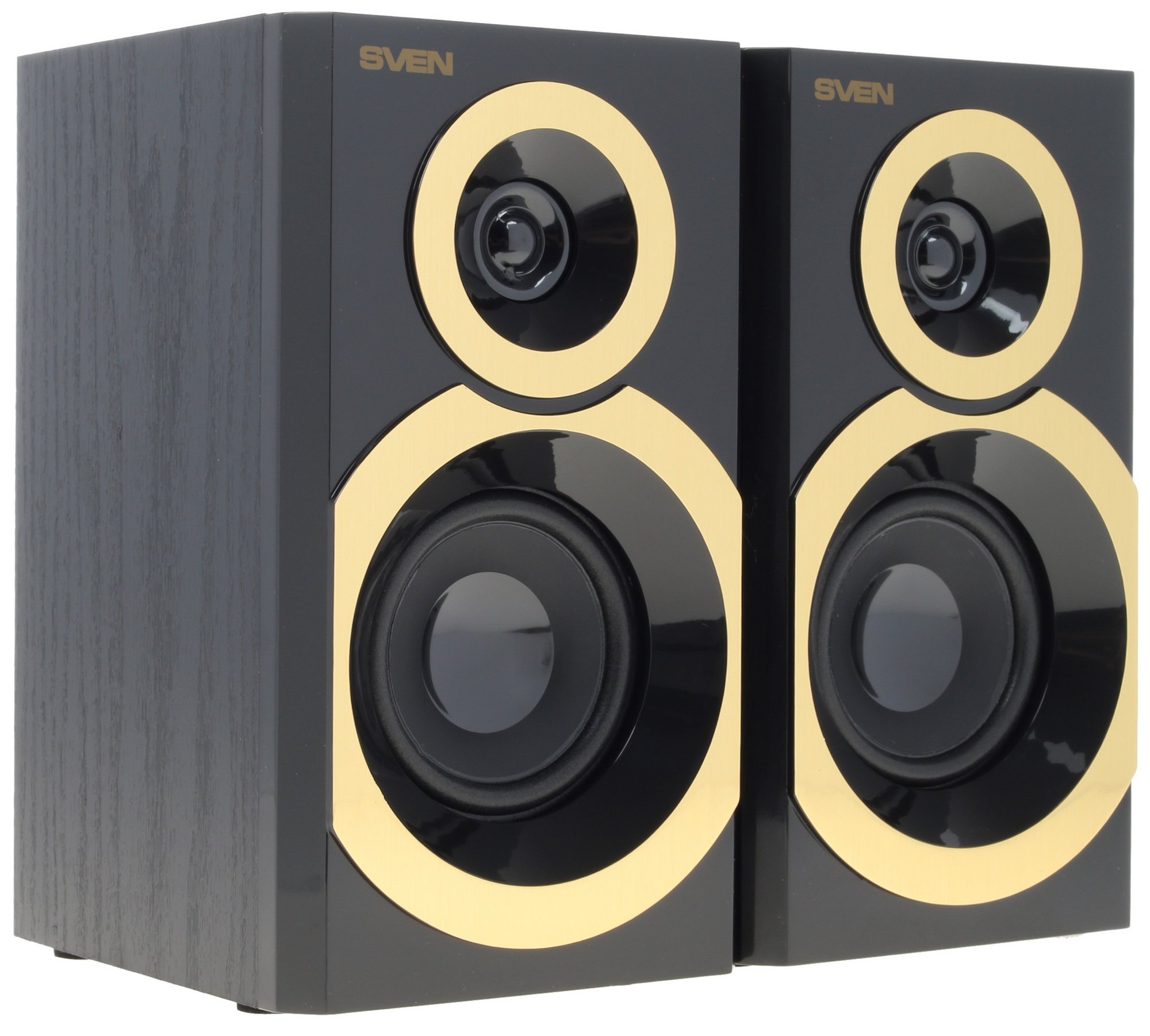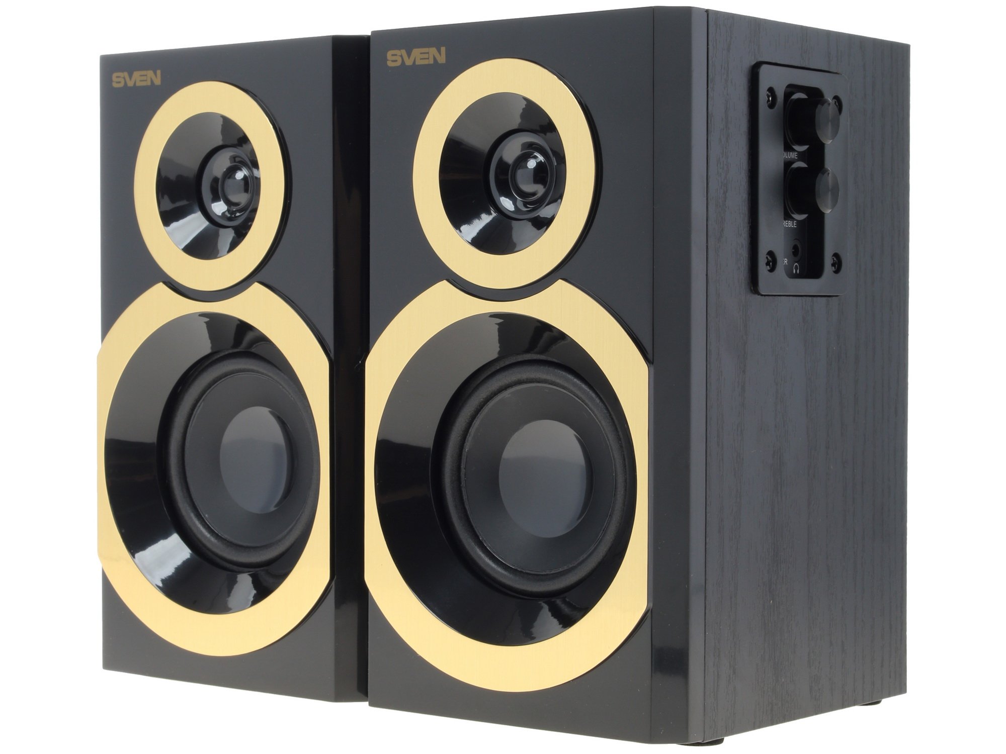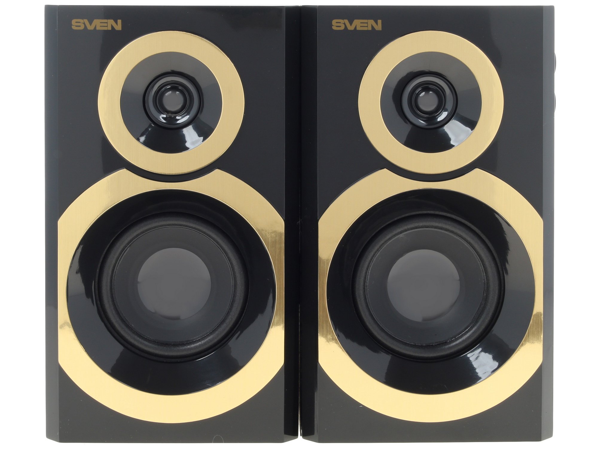 Компактные колонки SVEN SPS-619 без труда помещаются на компьютерном столе рядом с монитором, абсолютно не стесняя при этом пользователя. Передняя панель выполнена из черного блестящего глянца и украшена золотистыми элементами.