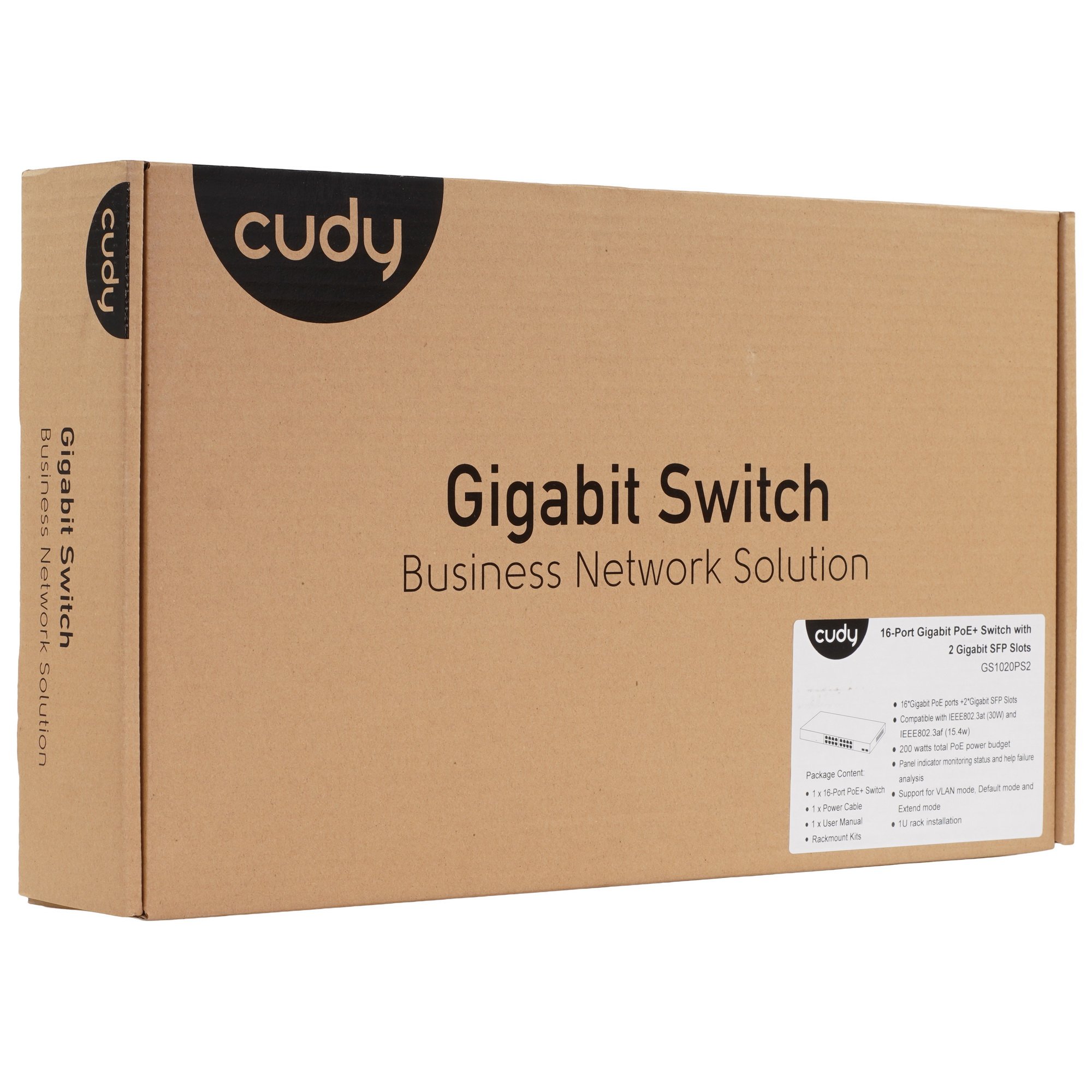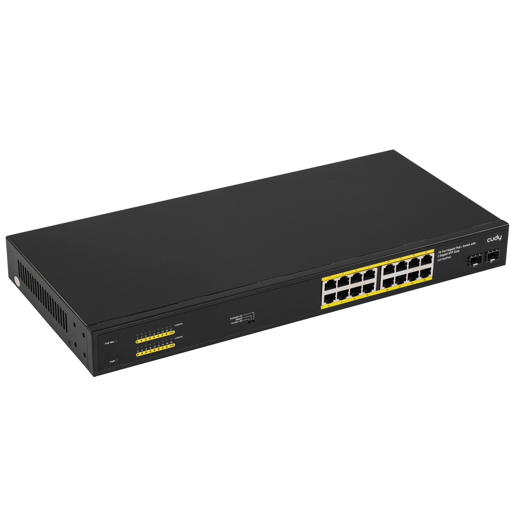 Cudy GS1020PS2 - это гигабитный коммутатор с 16 портами РоЕ/PoE+ и 2 гигабитными SFP оптоволоконными портами для высокоскоростного подключения. Через порты РоЕ передаются и электропитание, и данные к подключенным устройствам. Поддержка стандарта IEEE802.3af/at может обеспечить до 30 Ватт мощности на каждый из 16 портов, суммарно до 200 Вт на все PoE порты. Коммутатор имеет специальный переключатель DIP для выбора режима работы: VLAN, Default или Extend.