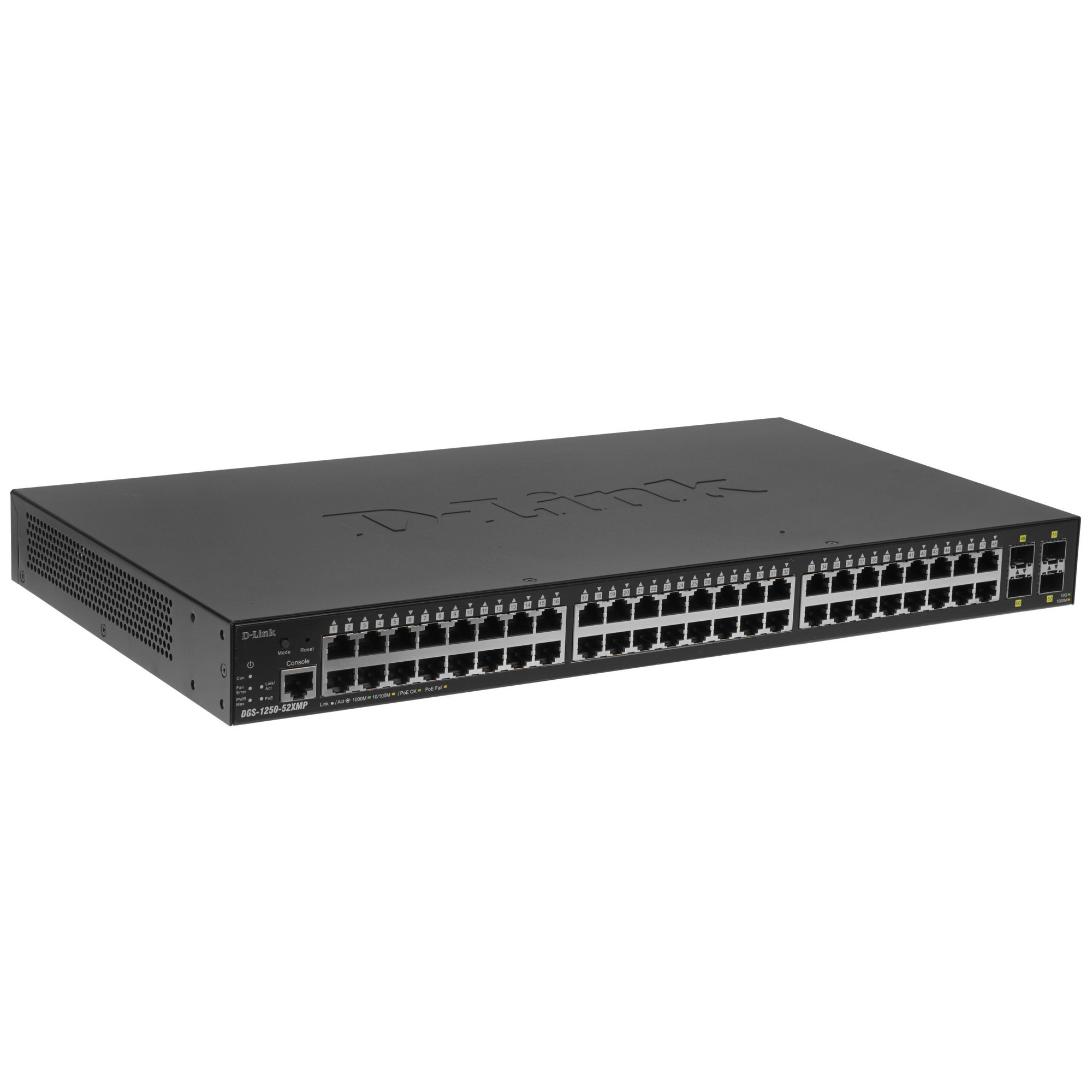 Коммутатор D-Link DGS-1250-52XMP/A1A, L2 Smart Switch with 48 10/100/1000Base-T ports and 4 10Gbase-X SFP+ ports (48 PoE ports 802.3af/802.3at (30 W), PoE Budget 370W).16K Mac address, 802.3x Flow Control, 4K