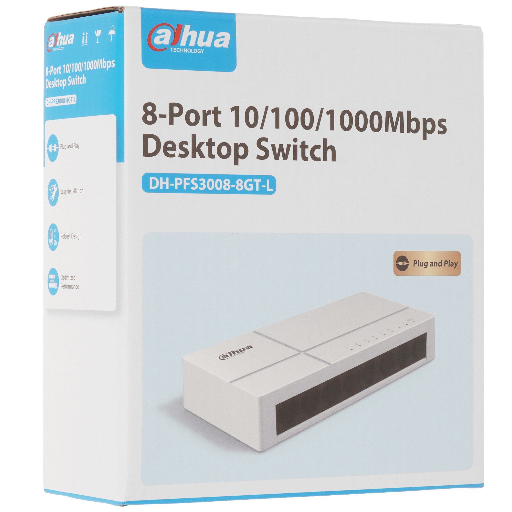 8 портов со скоростью передачи 10/100/1000 Мбит/с, сверхинтегральная конструкция, компактность, портативность, простота в эксплуатации – все эти свойства относятся к коммутатору DH-PFS3008-8GT-L, который подходит для малых и средних рабочих и домашних сетей.