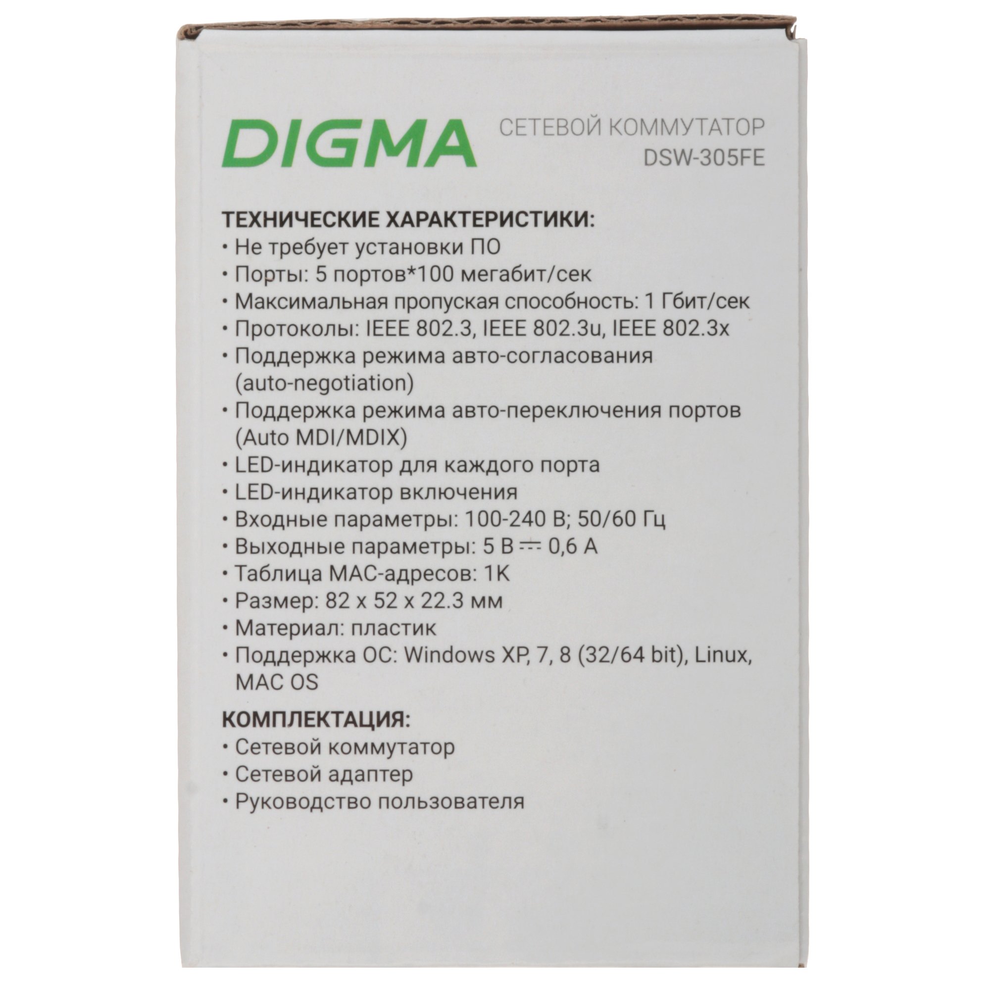 Сетевой коммутатор Digma DSW-305FE подойдёт для организации небольших локальных сетей дома или в офисе. Благодаря конструкции модели коммутатор размещается на рабочем столе или на полке без необходимости крепления к стене. Устройство имеет 5 портов RJ-45. Каждый поддерживает скорость передачи данных в 100 Мбит/с. Внутренняя пропускная способность DSW-305FE составляет 1 Гбит/с. Коммутатор поддерживает режим авто-согласования: автоматически определяет подходящие настройки для подключенных устройств, которые организуют стабильное соединение. Поддержка режима авто-переключения портов (Auto MDI/MDIX) упрощает процесс установки и подключения устройств к коммутатору. Модель совместима с различными сетевыми оборудованиями. Поддерживает протоколы IEEE 802.3, IEEE 802.3u, IEEE 802.3x. Размер компактного устройства 82 x 22.3 x 52 мм, поэтому он легко размещается на столе.
