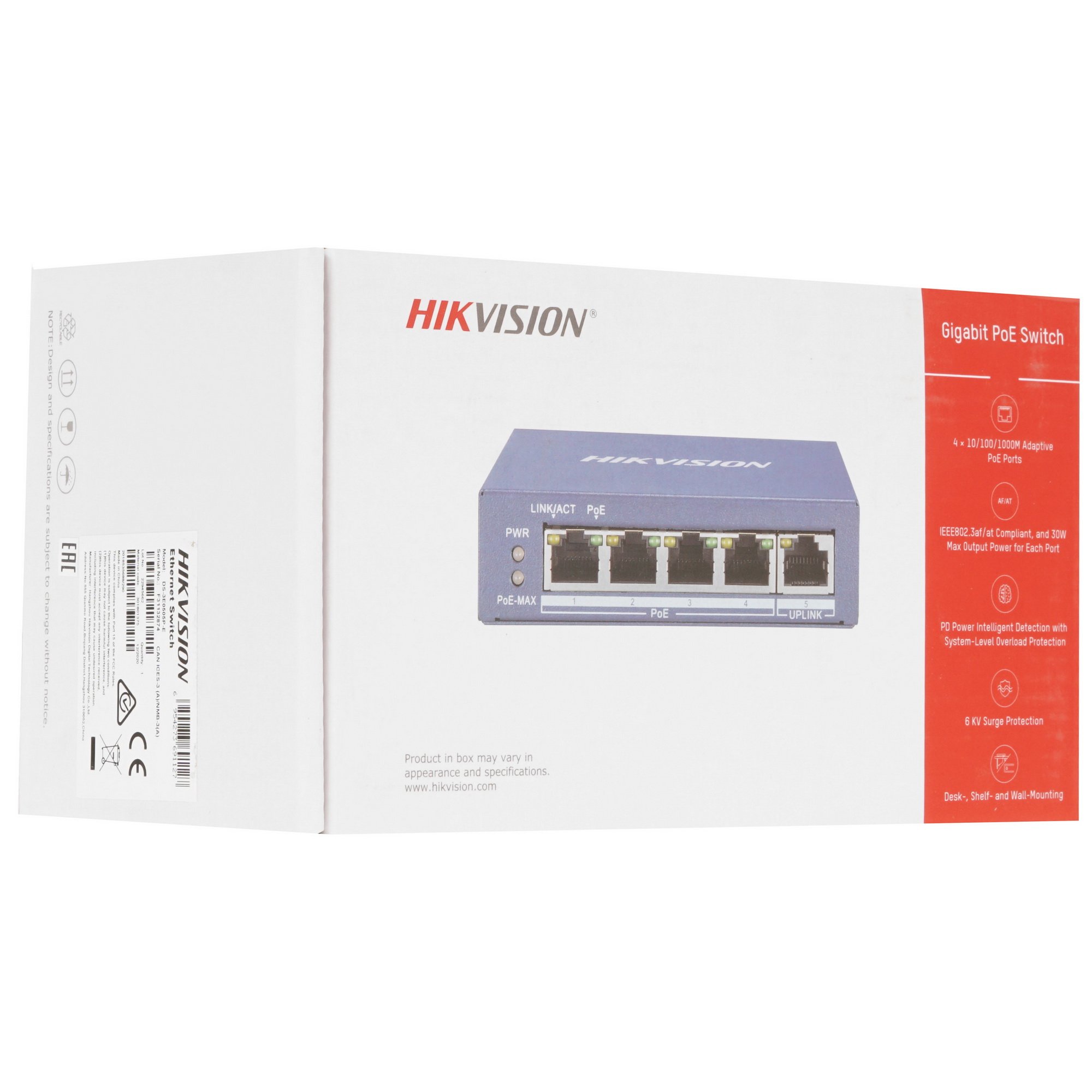 Коммутатор Hikvision DS-3E0505P-E относится к неуправляемому типу сетевого оборудования с методом коммутации Store and Forward. Благодаря этому устройство не только считывает адрес получателя, но и анализирует поступающие данные на предмет ошибок. Встроенная таблица MAC-адресов насчитывает 2000 позиций, скорость передачи данных может достигать 1000 Мбит/с. Помимо этого коммутатор поддерживает различные протоколы безопасности, что делает работу в сети безопасной. Для подключения оборудования на лицевой панели устройства предусмотрено 5 сетевых портов, 4 из которых поддерживает питание PoE.