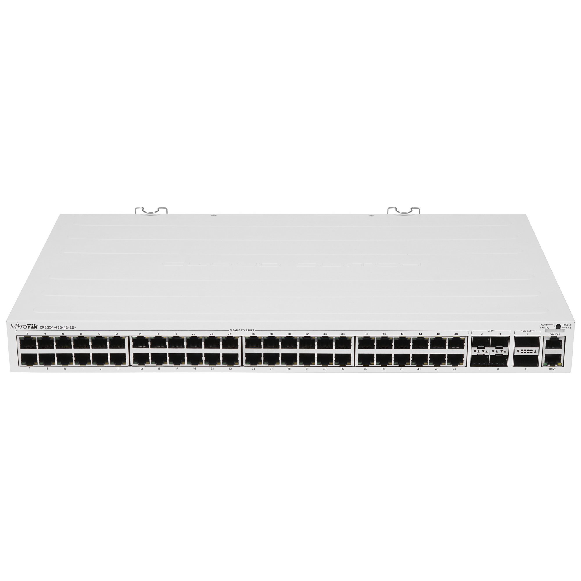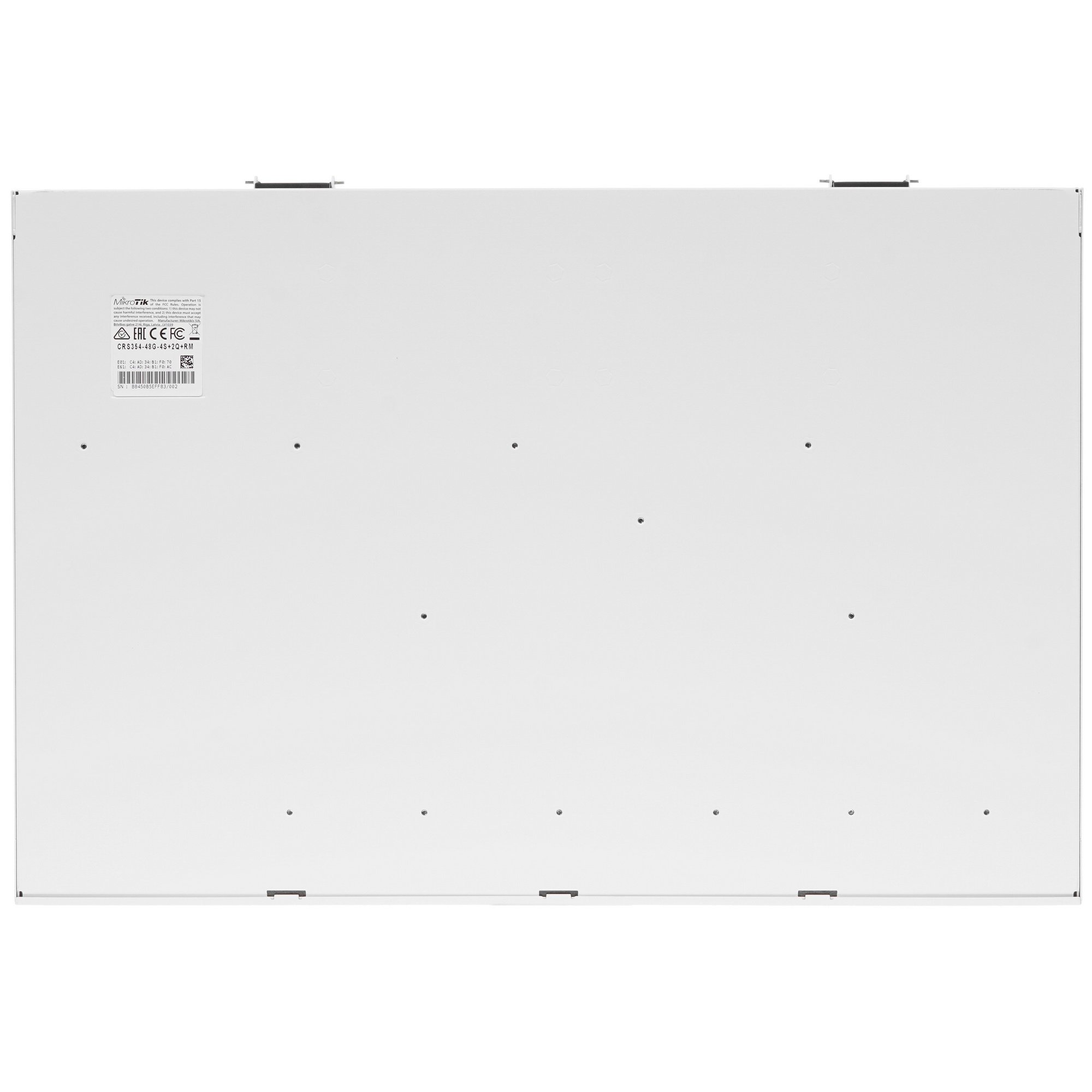 Коммутатор Mikrotik CRS354-48G-4S+2Q+RM выполнен в прочном металлическом корпусе и благодаря своим размерам может легко монтироваться в стойку для телекоммуникационного оборудования. Для работы используется сеть 220 В. Комплект поставки включает в себя 2 блока питания, кабель, крепеж для установки и руководство.