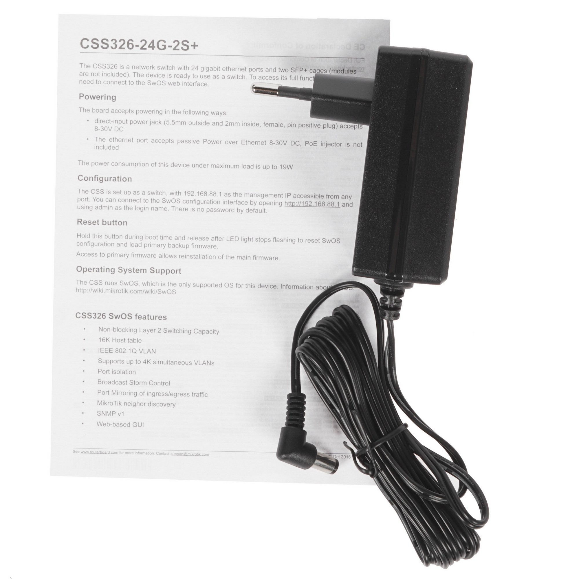 Необходимую электрическую энергию коммутатор получает от розетки. Он присоединяется к сети через адаптер, а пиковое энергопотребление у оснащения составляет 9.31 Вт.