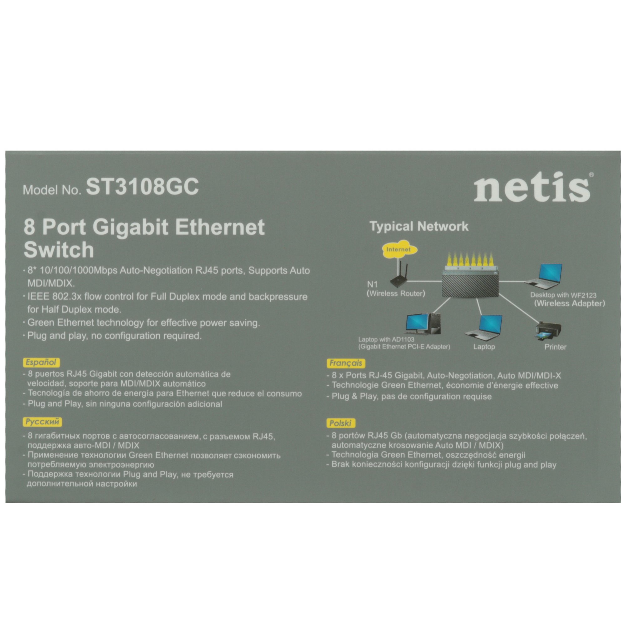 Коммутатор ST3108GC оснащен 8 портами RJ45 с автоматическим согласованием 10/100/1000 Мбит/с. Все порты поддерживают функцию автоматического MDI/MDIX, что устраняет необходимость в соединительных кабелях или портах восходящей линии связи. Этот коммутатор обеспечивает простое в использовании, высокопроизводительное, бесперебойное и стандартное обновление вашей сети до скорости 1000 Мбит/с. Это повысит производительность вашей сети за счет полнодуплексной скорости передачи данных до 2000 Мбит/с.