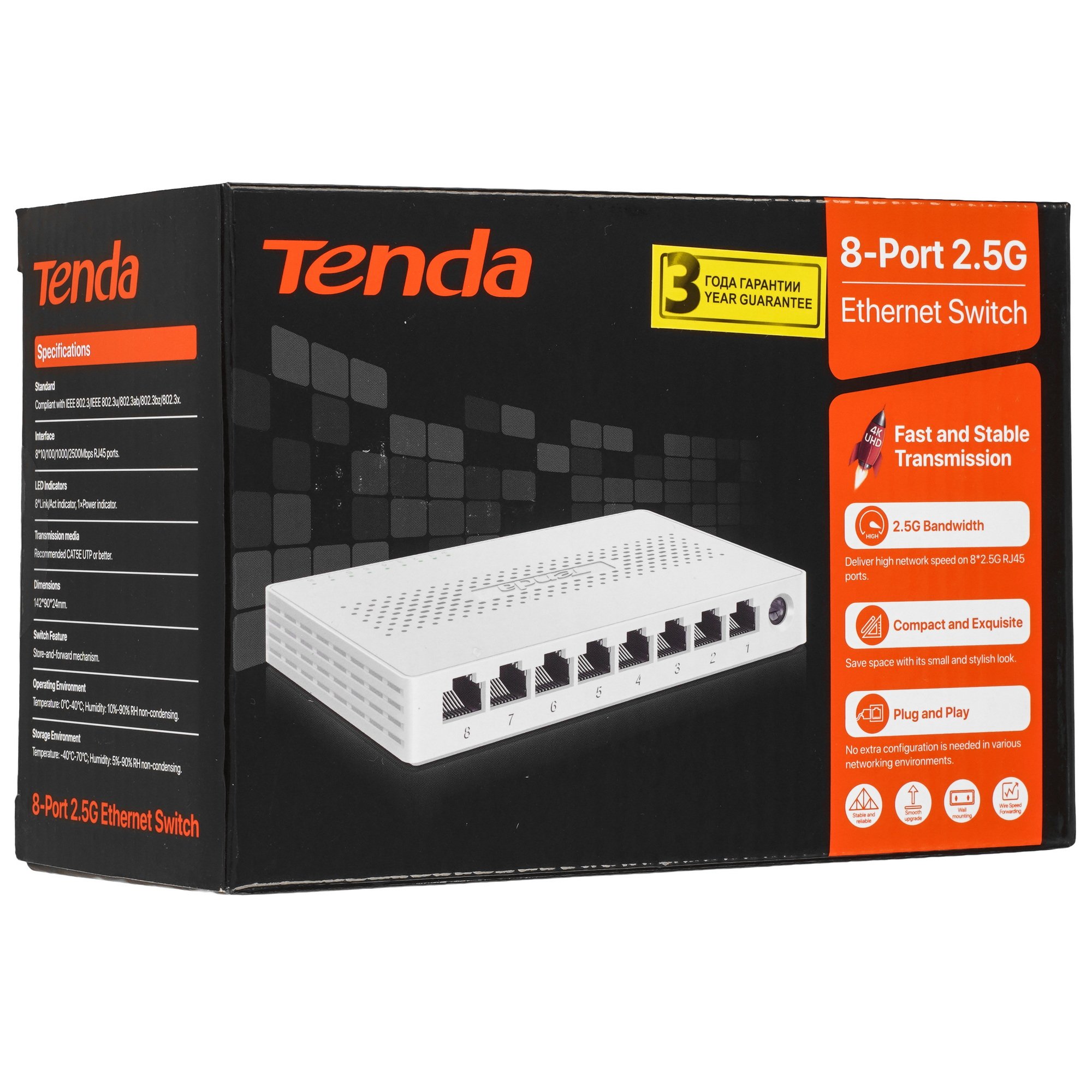 Коммутатор Tenda SM108 – это 8-портовый 2.5G Ethernet-коммутатор, разработанный компанией Tenda. Он оснащен 8 портами RJ45 по 2,5 Гбит/с и может подключаться к компьютерам, NAS, IPTV, точкам доступа Wi-Fi и другим устройствам для обеспечения высокоскоростного доступа в Интернет. Это идеальное устройство доступа для высокоскоростного развертывания сетей в малых и средних предприятиях, малых офисах, на частных виллах или в беспроводных сетях.