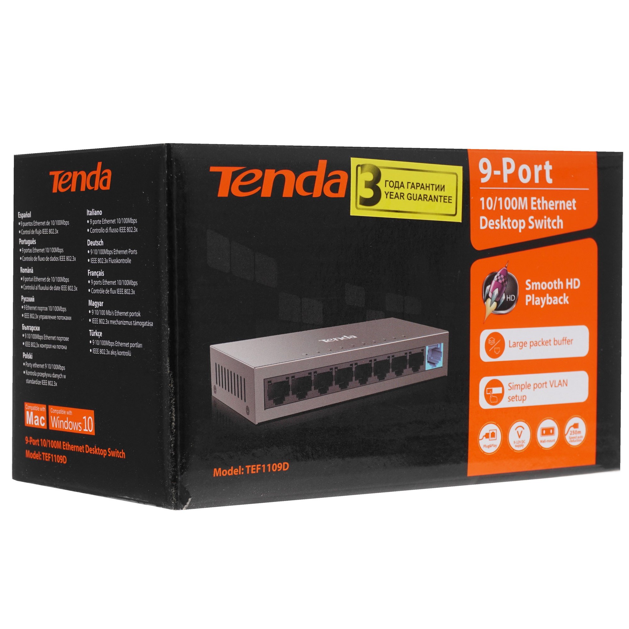 Коммутатор Tenda TEF1109D относится к числу неуправляемых моделей и осуществляет коммутацию подключенных устройств непосредственно после их подключения к портам. В модели реализовано автоматическое определение прямого или перекрещенного кабеля (MDI/MDIX). Передачу данных и подачу питания коммутатор осуществляет по кабелям на расстояние до 250 м.