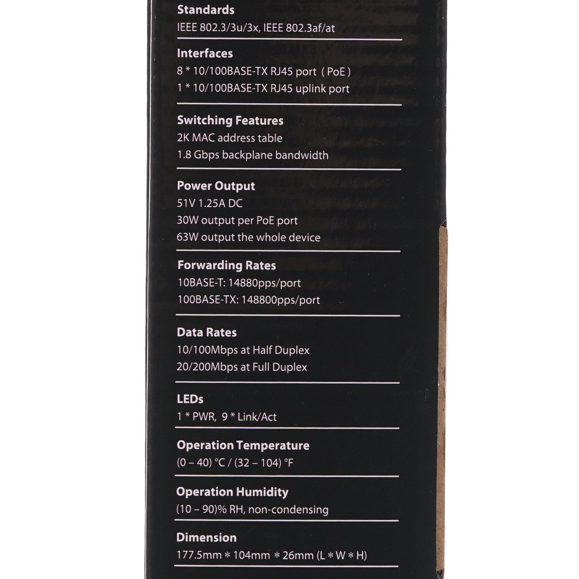 Неуправляемый 9-портовый коммутатор Tenda TEF1109P-8-63W ориентирован на «обслуживание» PoE-совместимого оборудования, например – IP-камер и IP-телефонов. Поддержка питания по витой паре реализована на всех 8 «клиентских» портах. Бюджет PoE, составляющий 58 Вт, позволяет не испытывать сложностей в процессе выбора совместимых сетевых устройств. Базовая скорость передачи данных коммутатора составляет 100 Мбит/с. Внутренняя пропускная способность устройства, равная 1.8 Гбит/с, достаточна для эффективного функционирования всех портов с полной загрузкой.