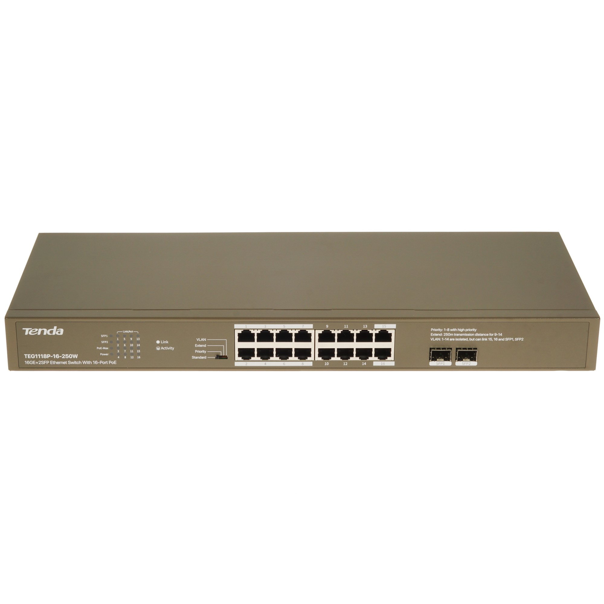 Собранный в эффектном коричневом корпусе неуправляемый гигабитный коммутатор Tenda TEG1118P-16-250W станет отличным выбором для владельцев PoE-совместимого оборудования, например – IP-телефонов, IP-камер и точек доступа. Обеспечив питание таких устройств по витой паре, вы значительно упростите обустройство сети или системы видеонаблюдения. Поддержка PoE реализована на всех 16 портах Ethernet. Суммарный бюджет PoE, равный 230 Вт, позволяет не испытывать сложностей с выбором совместимых сетевых устройств. Помимо Ethernet-портов, коммутатор оборудован парой портов SFP. Внутренняя пропускная способность модели, равная 36 Гбит/с, позволяет не испытывать сложностей при интенсивном характере обмена данными. Важная особенность коммутатора – наличие грозозащиты.