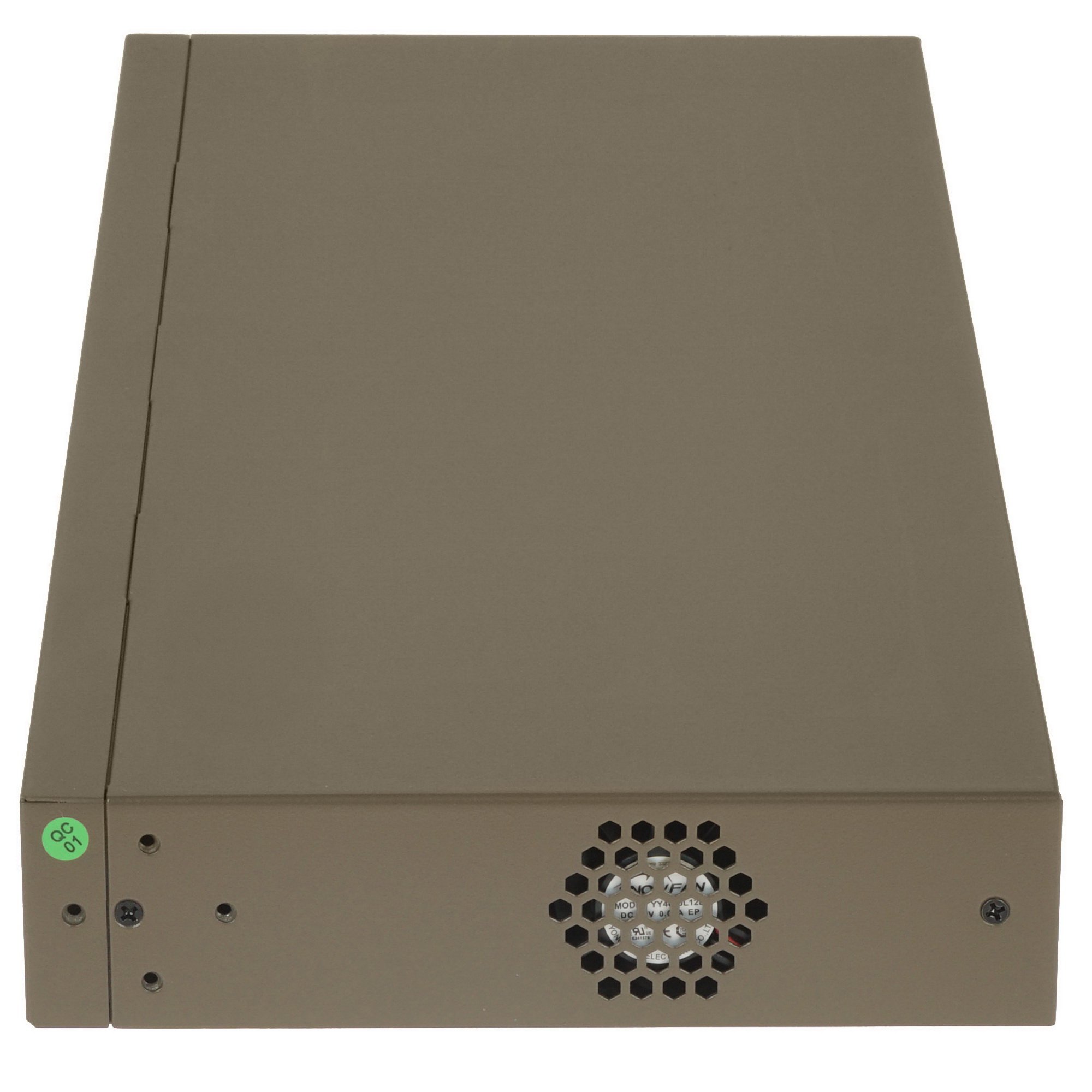 Базовая скорость коммутатора – 100 Мбит/с. Общее количество Ethernet-портов – 26 (2 порта имеют скорость 1 Гбит/с). В оснащение модели также входит порт SFP. Важной особенностью коммутатора является наличие грозозащиты.