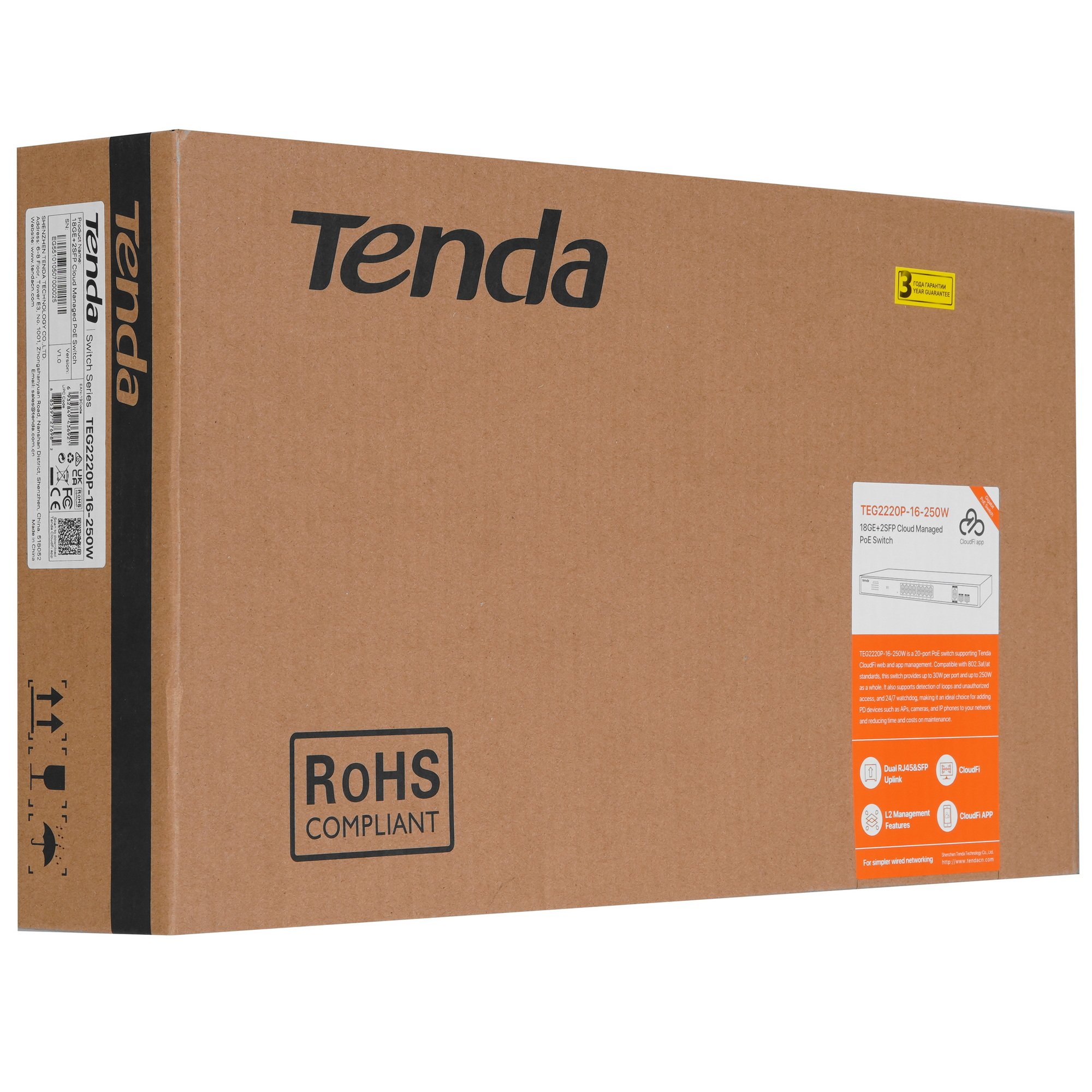 Коммутатор управляемый PoE Tenda TEG2220P-16-250W, 18 портов, 18x1 Gbит/с, SFP 2x1 Gbит/с, PoE 16x30Вт (до 230Вт)