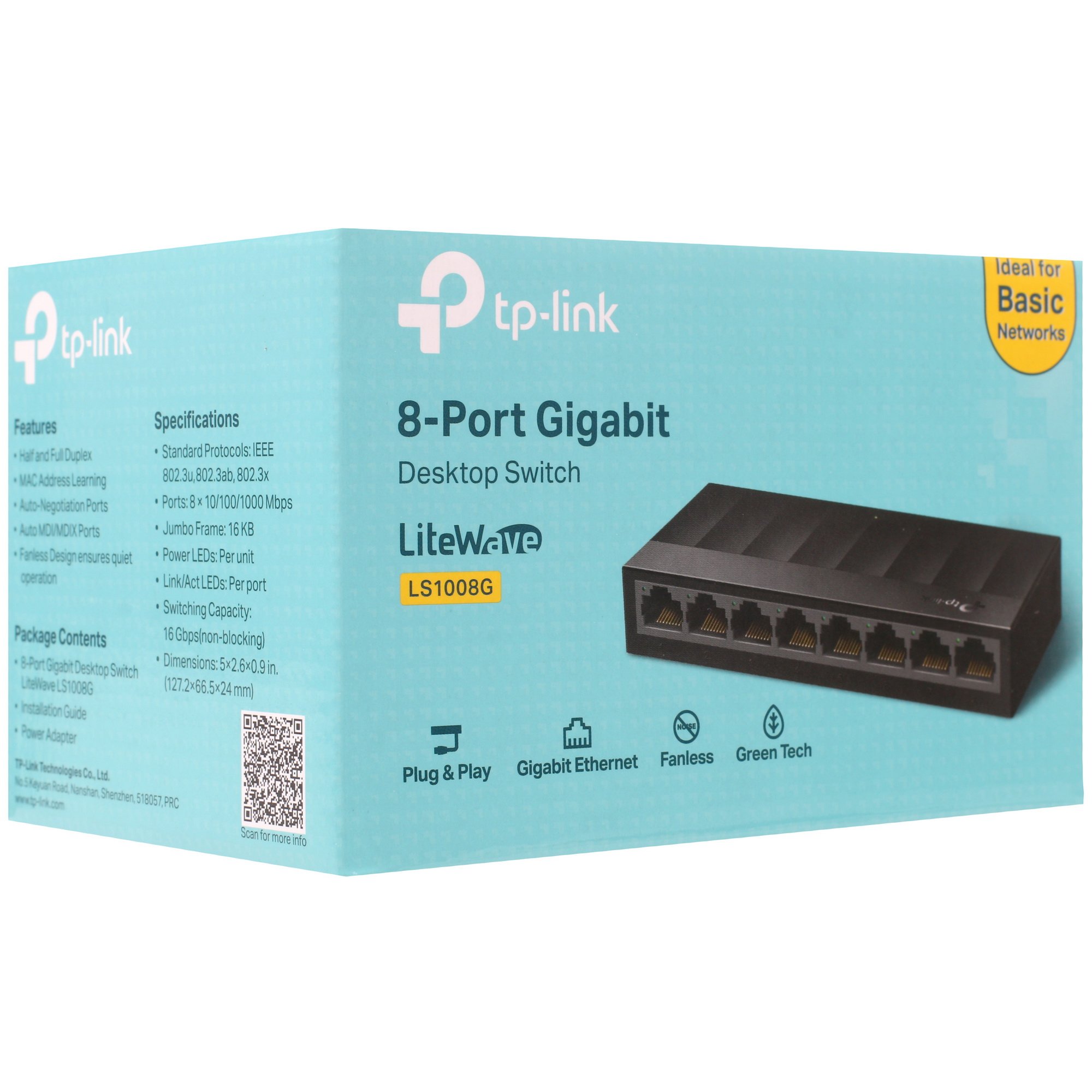 Коммутатор TP-Link LS1008G относится к неуправляемому типу устройств, имеет таблицу, насчитывающую 4000 MAC-адресов и поддерживает множество сетевых стандартов IEEE 802.3, благодаря чему отличается высокой внутренней производительностью. Для подключения оборудования предусмотрено 8 портов с пропускной способностью до 1000 Мбит/с.