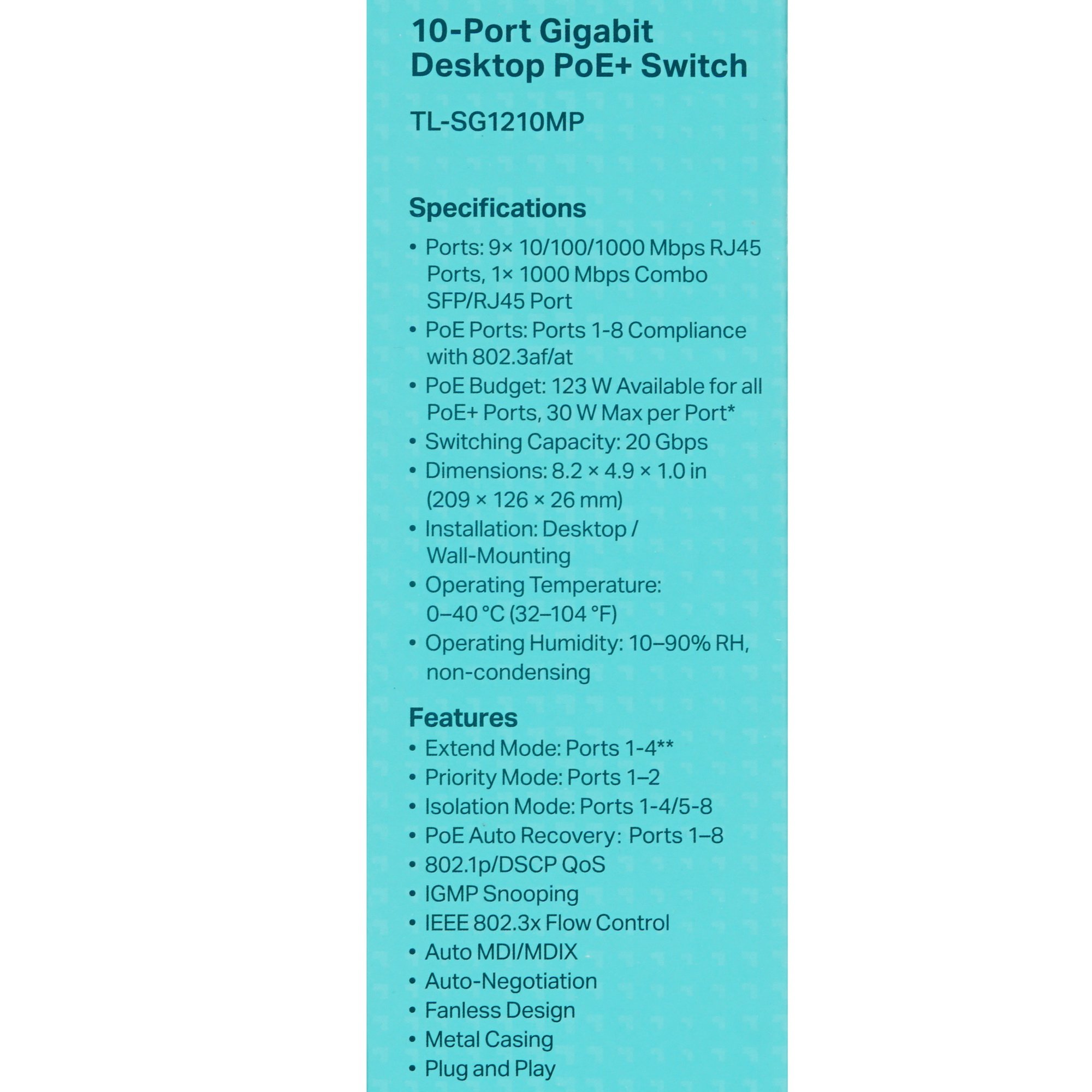 Коммутатор TP-Link TL-SG1210MP предназначен для настольного размещения. Подключение оборудования производится при помощи 10 портов, из которых 8 поддерживают питание по технологии PoE. Для вашего удобства на лицевой панели предусмотрен ряд светодиодных индикаторов. Корпус модели надежно защищен от внешних воздействий. Полностью бесшумное охлаждение предотвратит перегрев коммутатора и сделает его использование комфортным. Подключение к сети 220 В производится при помощи комплектного адаптера.