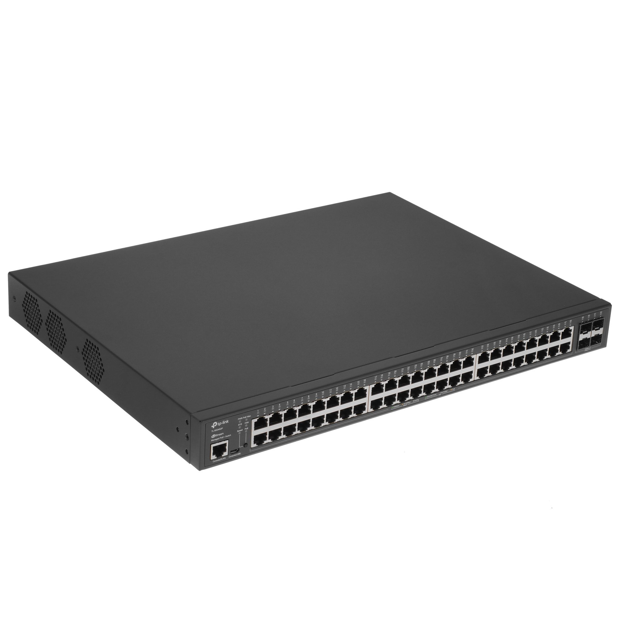 Соответствующий уровню 2+ управляемый коммутатор TP-Link TL-SG3452P оснащен 48 гигабитными портами Ethernet и 4 портами SFP. Главная особенность модели – поддержка технологии PoE. Все Ethernet-порты способны обеспечивать питание PoE-совместимого оборудования. Вы сможете избежать затрат на организацию выделенных линий электропитания. Суммарный бюджет PoE, гарантируемый коммутатором, равен существенным 384 Вт. Максимальная мощность одного порта – 30 Вт.