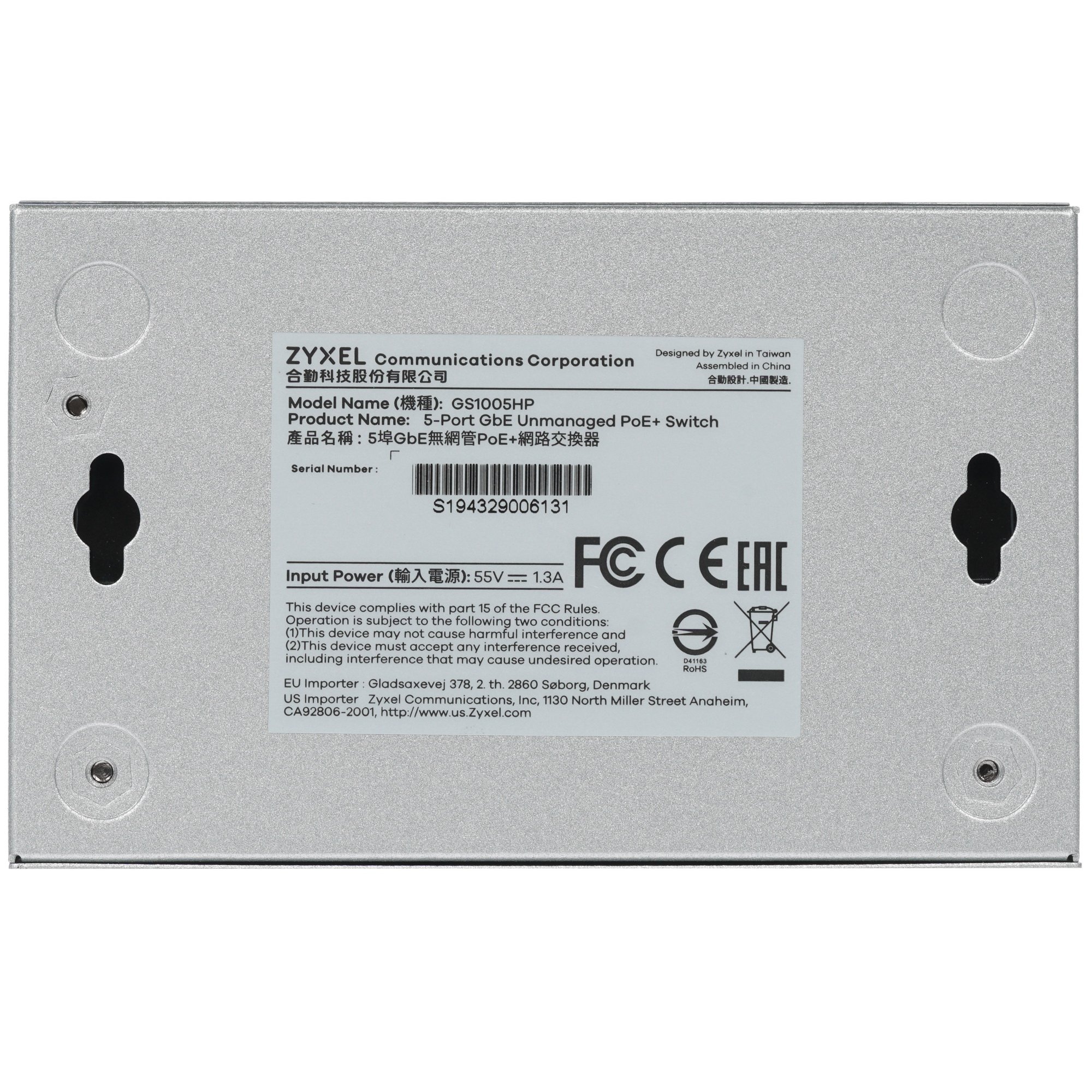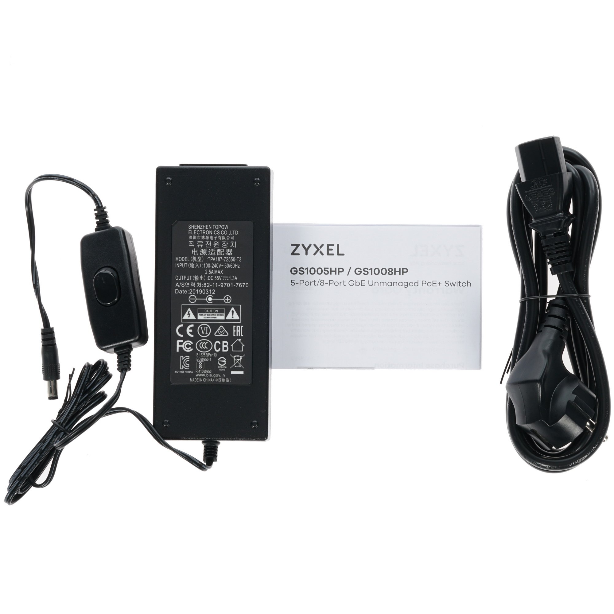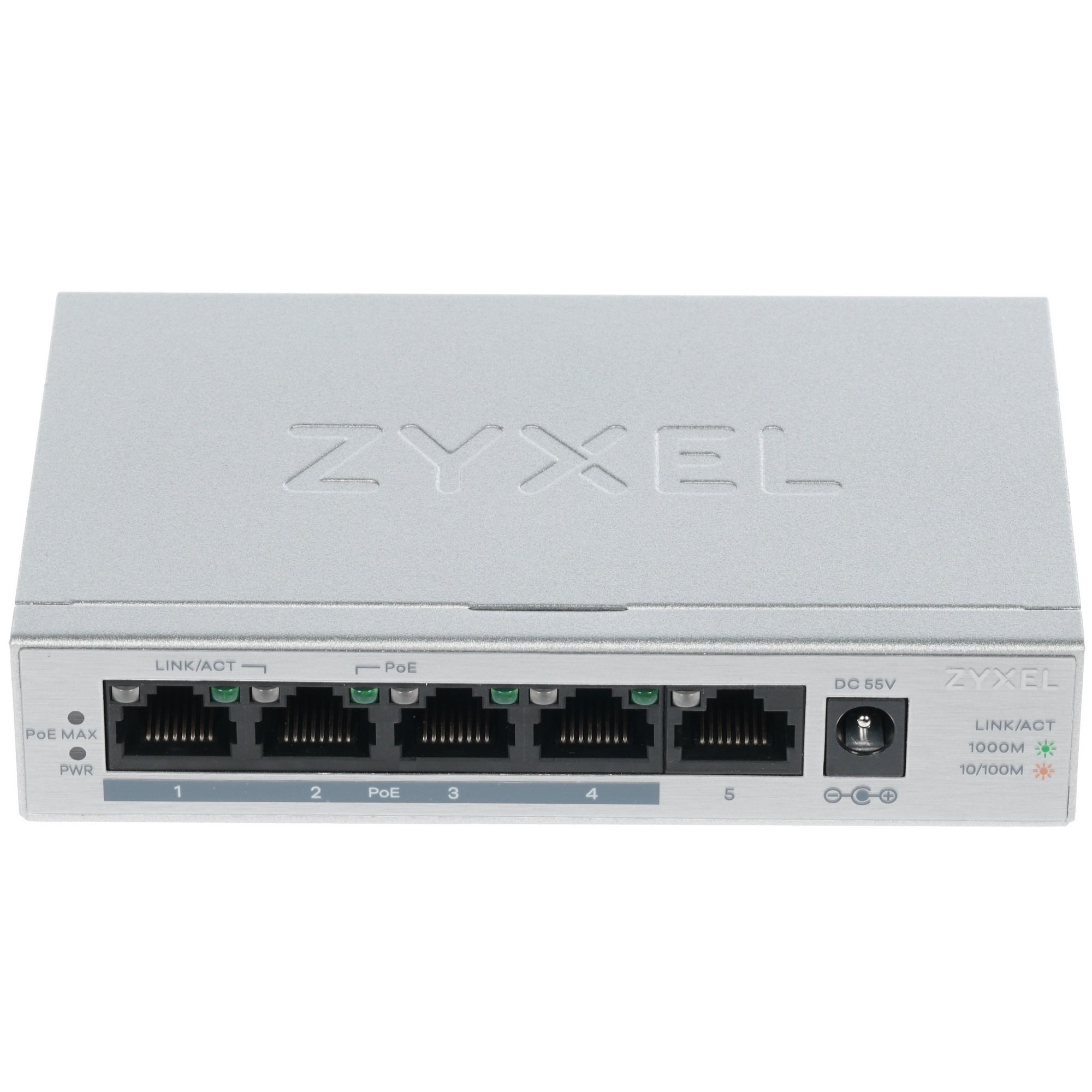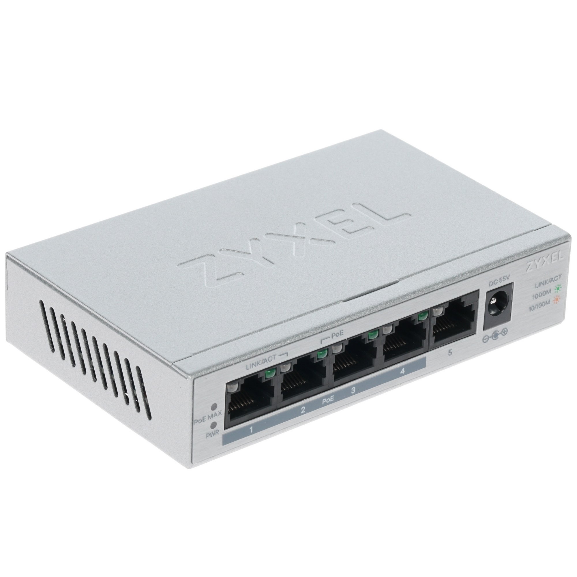 Коммутатор Zyxel GS1005HP Switch PoE +, 5xGE (4xPoE +), desktop, metal, silent, PoE budget 60 W