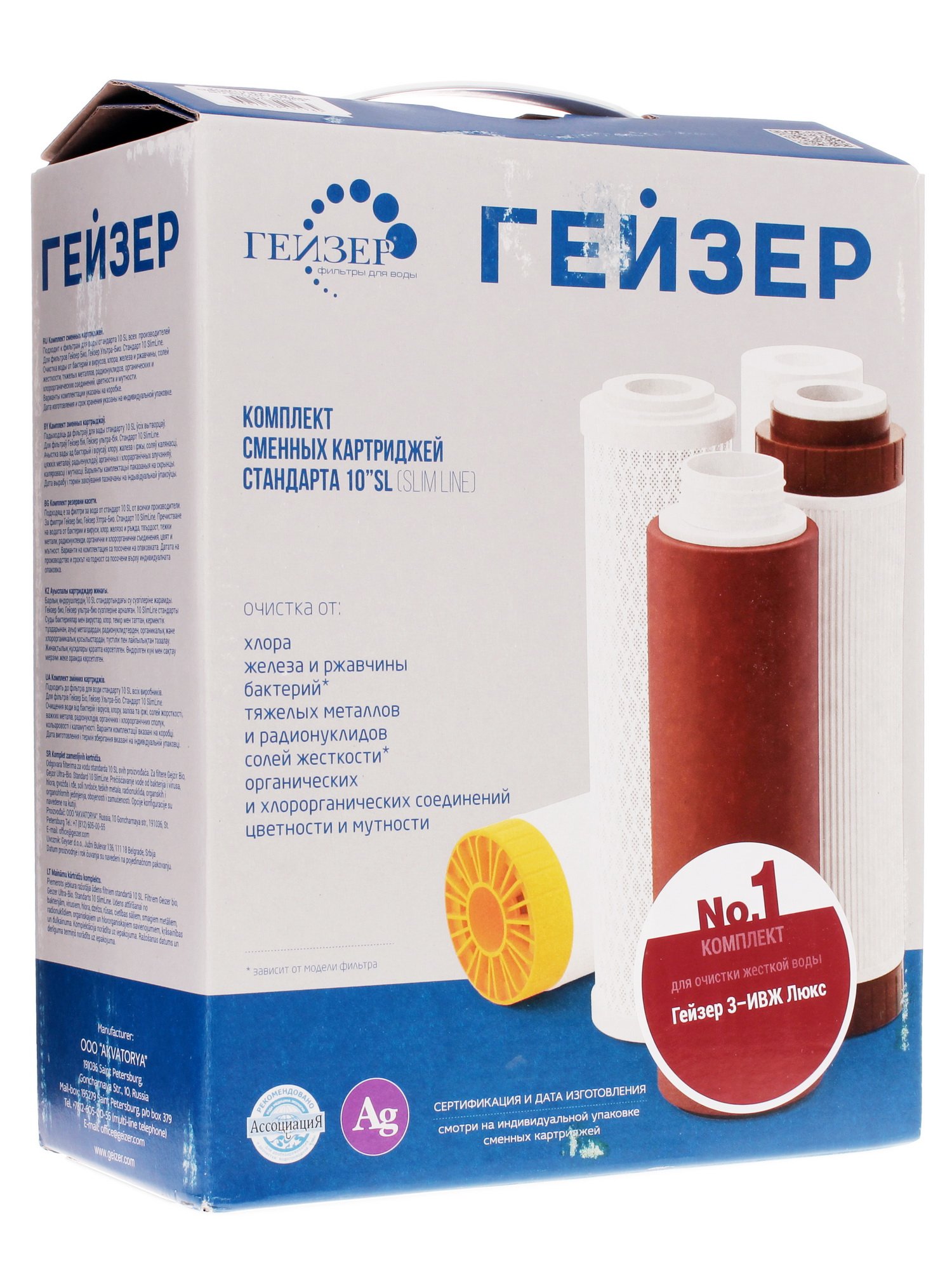 Комплект картриджей Гейзер №1 50001 состоит из 3 сменных изделий и переходной муфты и подходит для одной-единственной модели проточного фильтра – Гейзер 3 ИВЖ Люкс. Помимо "просеивания" песка, железа и тяжелых металлов, эти фильтры способны на избавление от бактерий и даже от посторонних неприятных запахов. Более того, при использовании фильтров из комплекта Гейзер №1 50001 так называемая "жесткая" проточная вода станет мягче, значительно снижая образования накипи при последующем кипячении. Скорость фильтрации составляет 3 л/мин; следует помнить, что максимальная температура воды не должна превышать 40 °С.