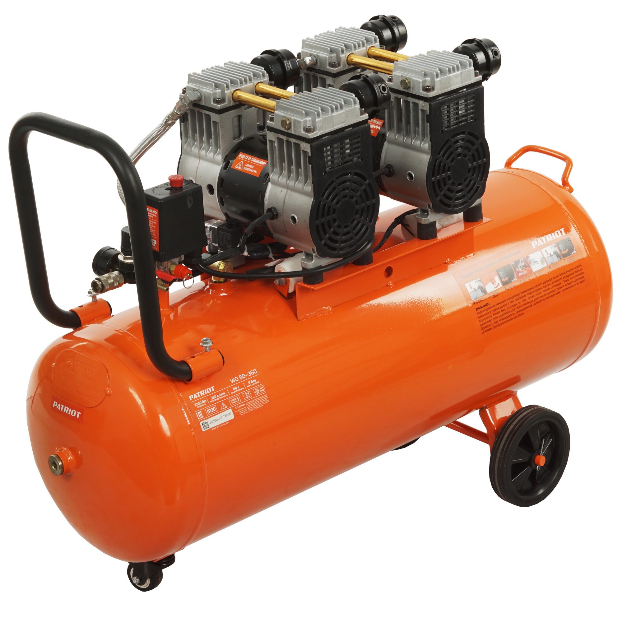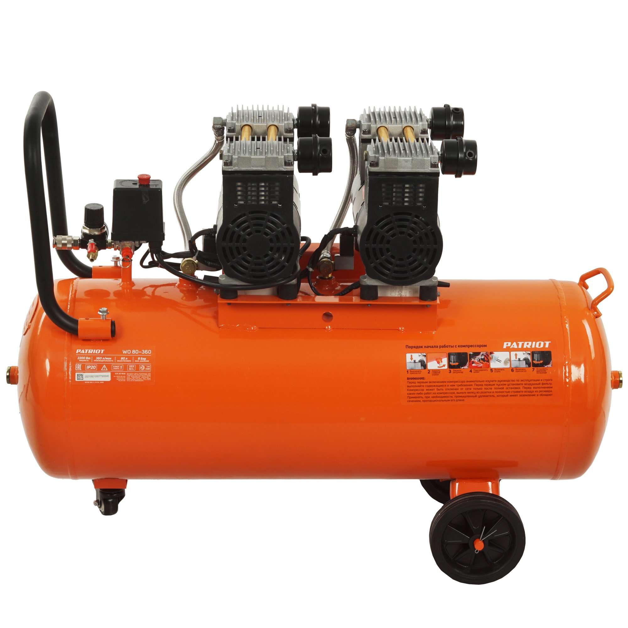 Компрессор Patriot поршневой безмасляный WO 80-360, 360 л/мин, 8 бар, 2200 Вт, 80 л, быстросъем и "елочка" с вентилем
