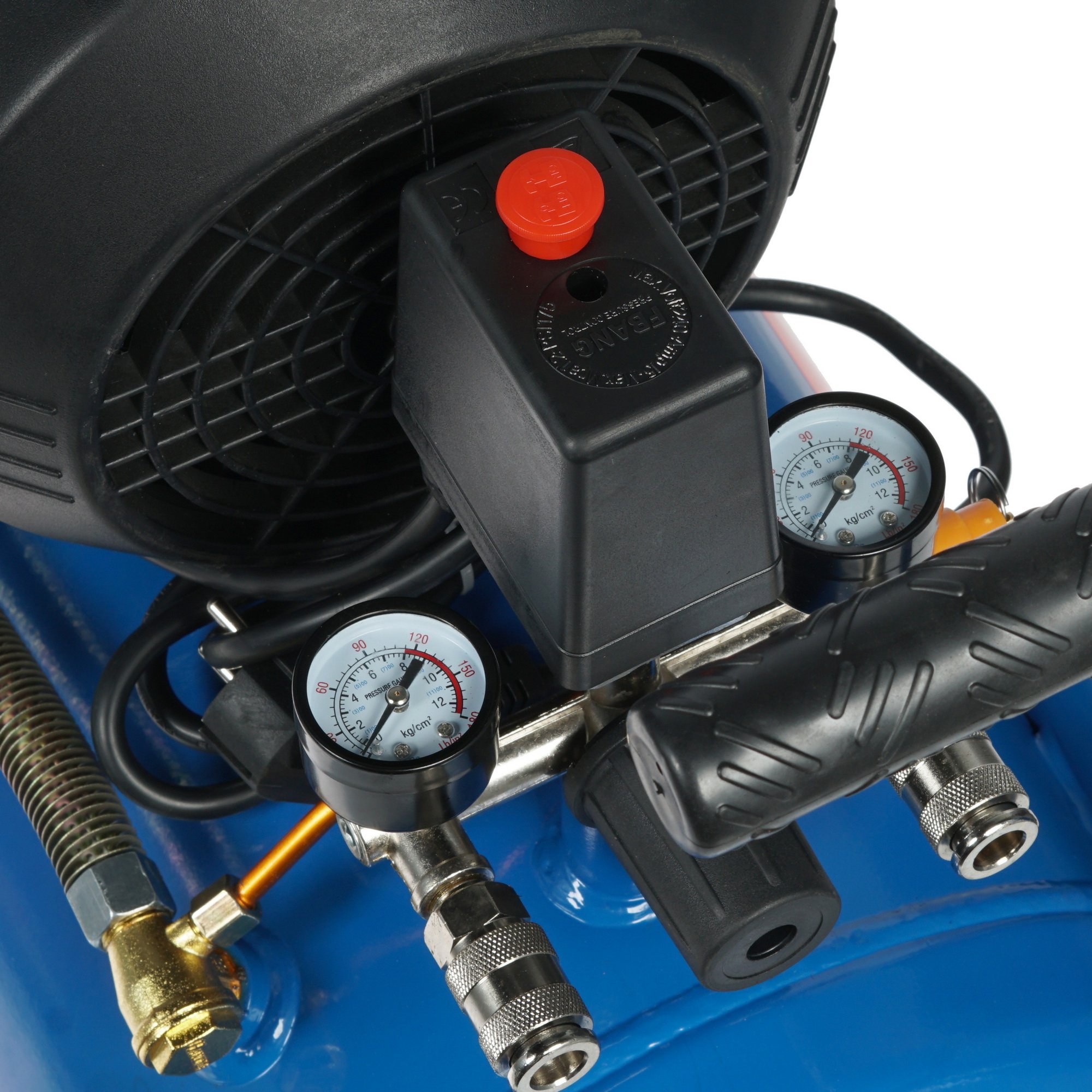 Воздушный компрессор Диолд КМП-2300/50 отличается наибольшим выходным давление воздуха на уровне 8 бар и располагает стрелочным манометром для выбора точного значения давления на выпуске. С помощью другого аналогового манометра вы сможете узнать актуальное значение давления в ресивере. При весе 42 кг аппарат укомплектован рукояткой и парой колес, упрощающих его перемещение. Гарантийный талон и руководство по эксплуатации включены в его комплектацию.