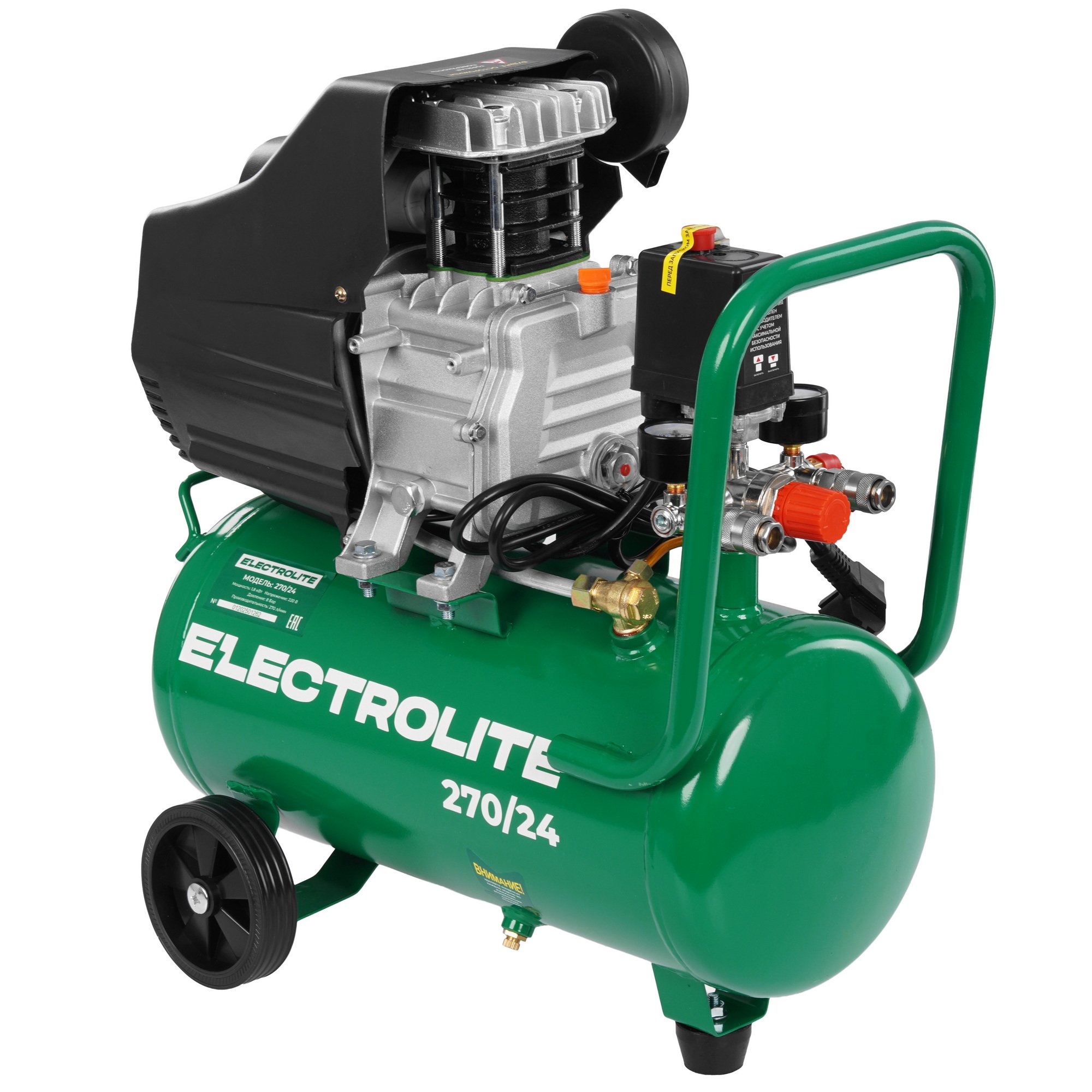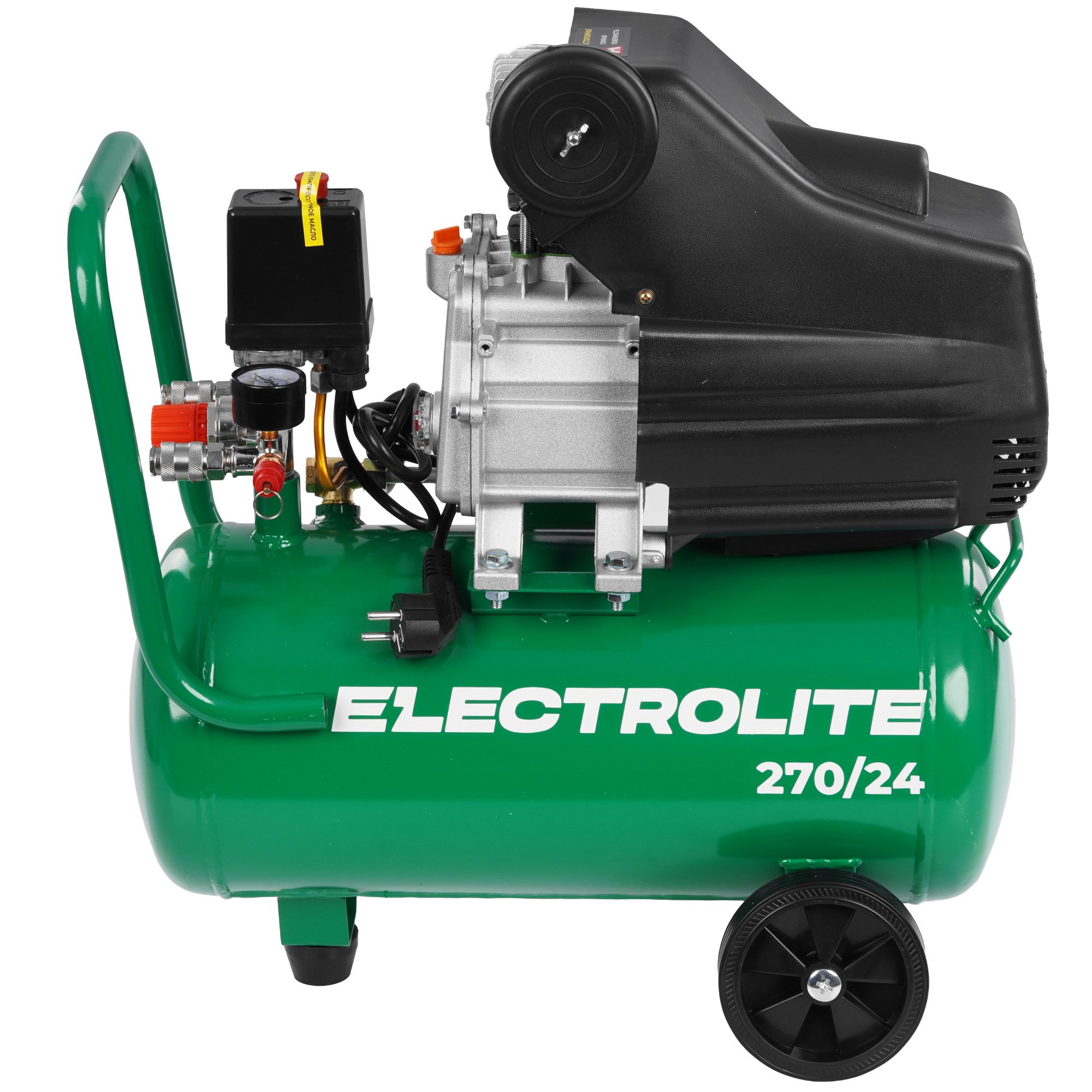 Компрессор воздушный Electrolite 270/24 — поршневой масляный компрессор мощностью 1800 Вт с ресивером 24 л и производительностью 270 л/мин. Идеален для домашней мастерской и автосервиса: покраска, подкачка колес, работа с пневмоинструментом. Оснащён чугунной головкой, защитой от перегрева и двумя быстросъемными выходами с регулировкой давления. Корпус покрыт прочным порошковым покрытием.