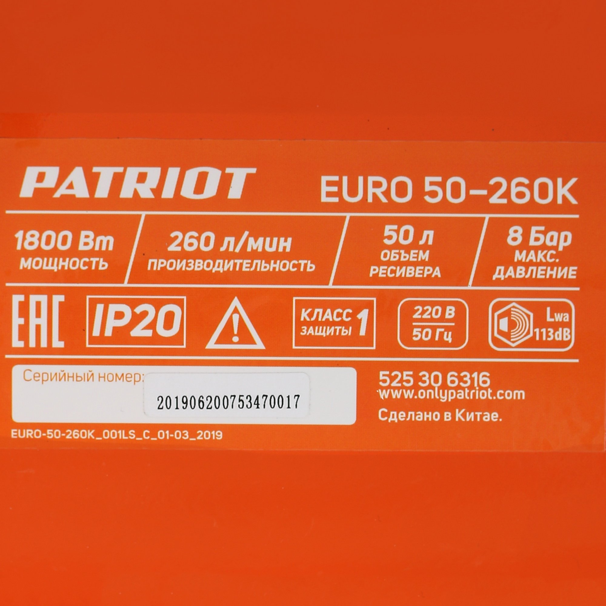 Компрессор PATRIOT EURO 50-260К 525306316 Мощность: 1.8 кВт; Напряжение: 230В~50Гц; Обороты двигателя: 2850 об/мин; Производительность: 260 л/мин; Объем ресивера: 50 л; Давление: 8 бар; Вес: 28,5