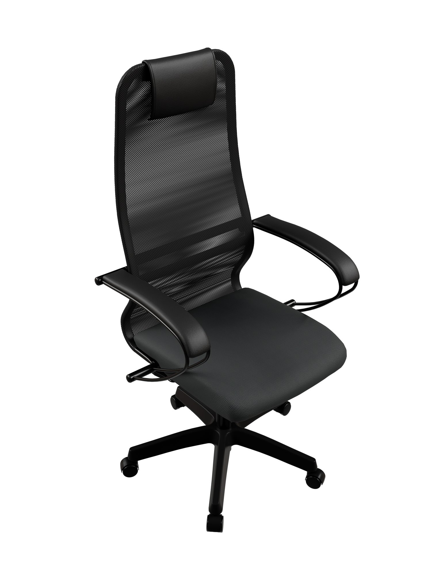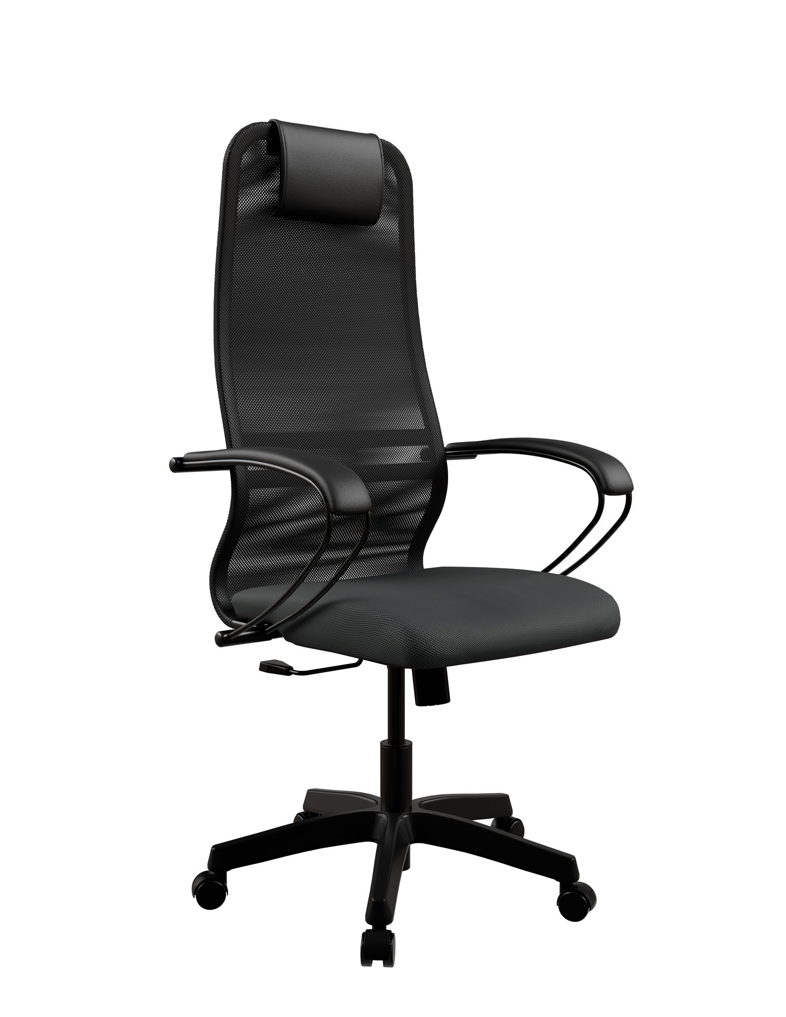 Метта SU-B-8/подл.130/осн.001 оснащено высокой спинкой с подголовником, нерегулируемыми стальными подлокотниками с кожаными накладками. Механизм топ-ган с регулировкой жесткости качания по весу человека позволяет откидываться на спинку для отдыха и снятия мышечного напряжения. Вы можете настраивать удобное положение поясничной области и наклонять спинку.