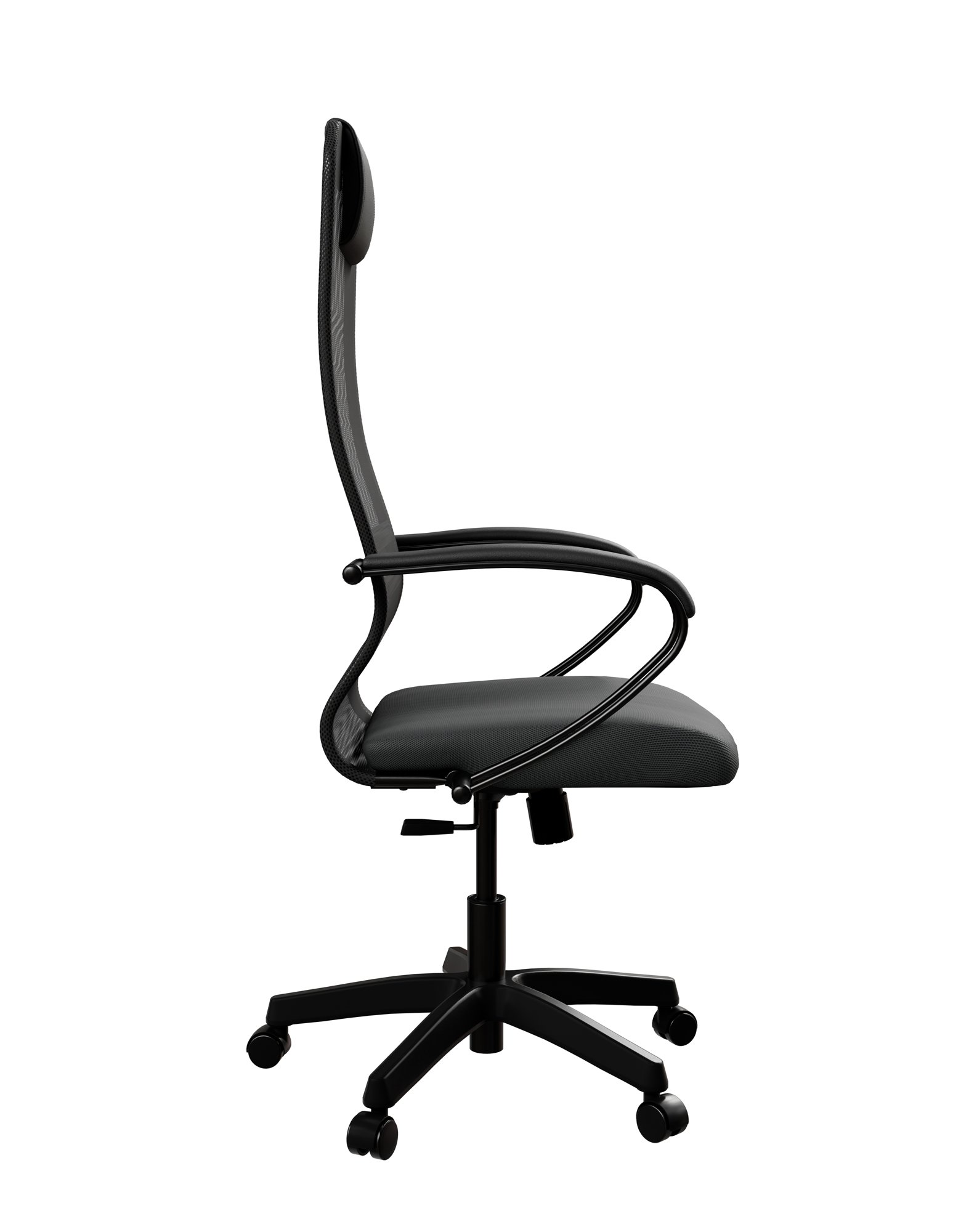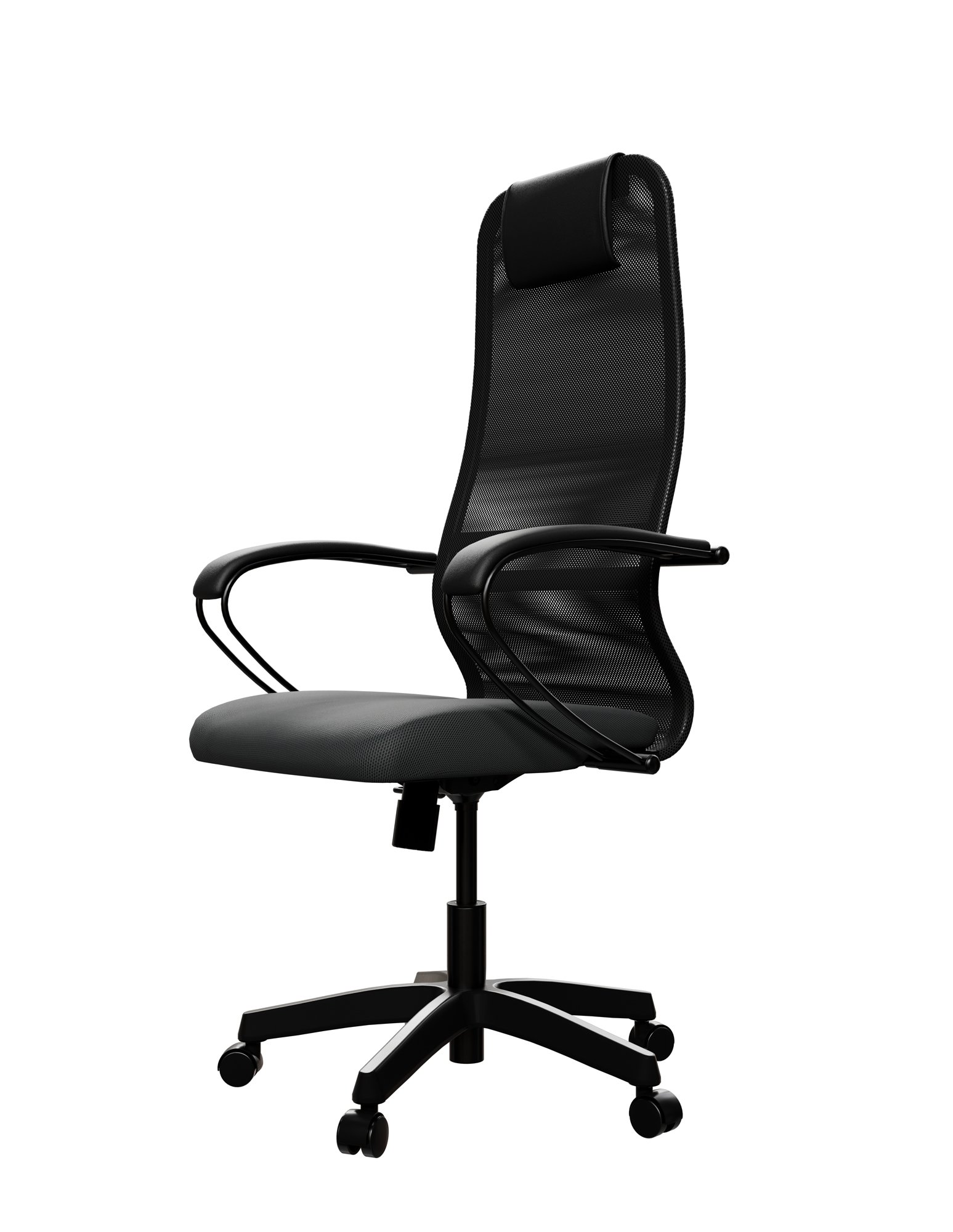 Черное компьютерное кресло Метта SU-B-8/подл.130/осн.001 с пластиковой крестовиной выдерживает нагрузку в 120 кг. Мебель оснащена устойчивой к износу и простой в уходе тканевой обивкой с дышащей сеткой. Под сиденьем есть рычаг для настройки его высоты в зависимости от роста и личных предпочтений.