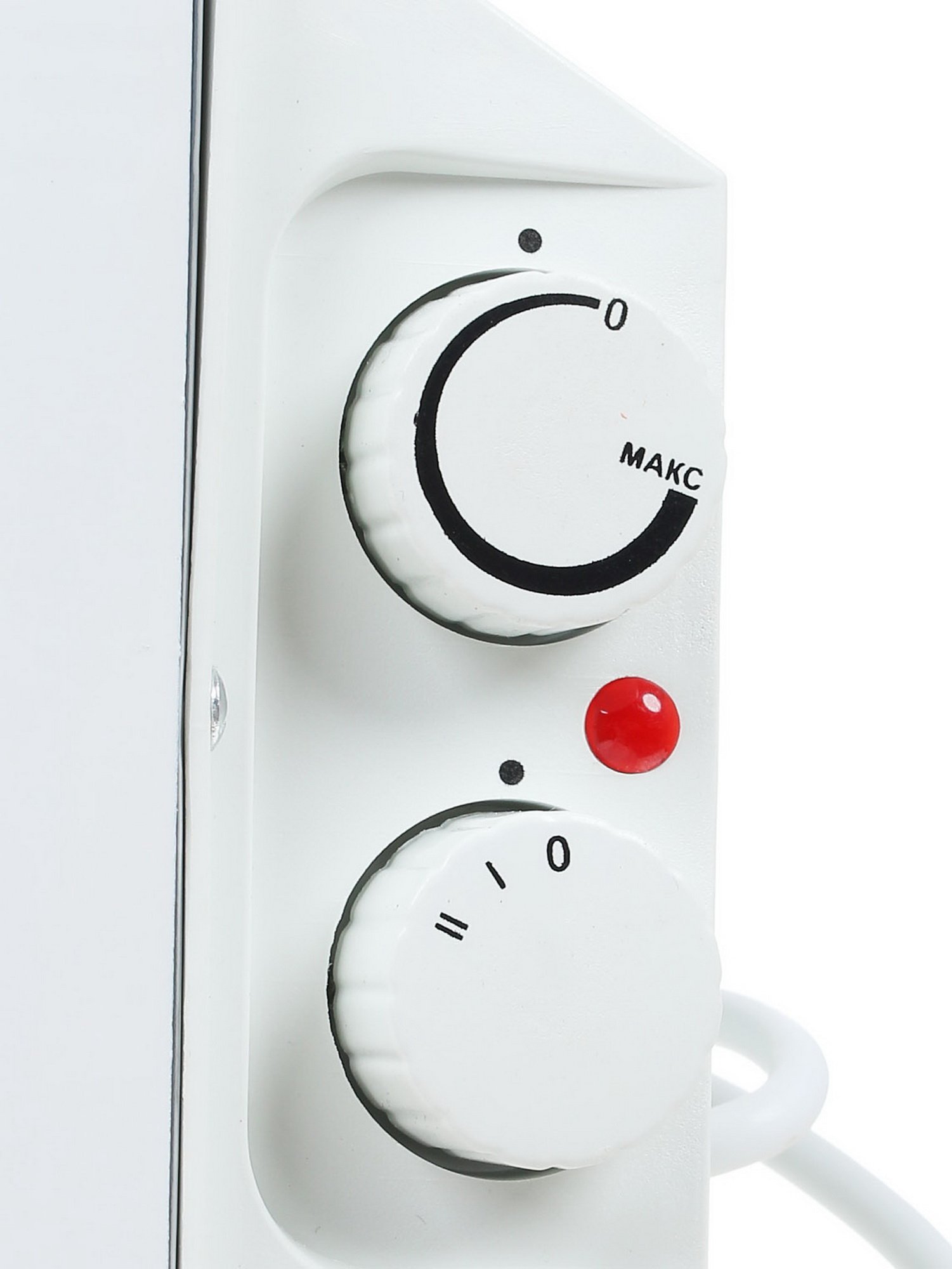 Максимальная площадь для обогрева - 20 м². Конвектор можно установить в стандартном помещении. Управление у устройства механического типа, оно простое и удобное. Есть светодиодный индикатор, который указывает на рабочий режим.