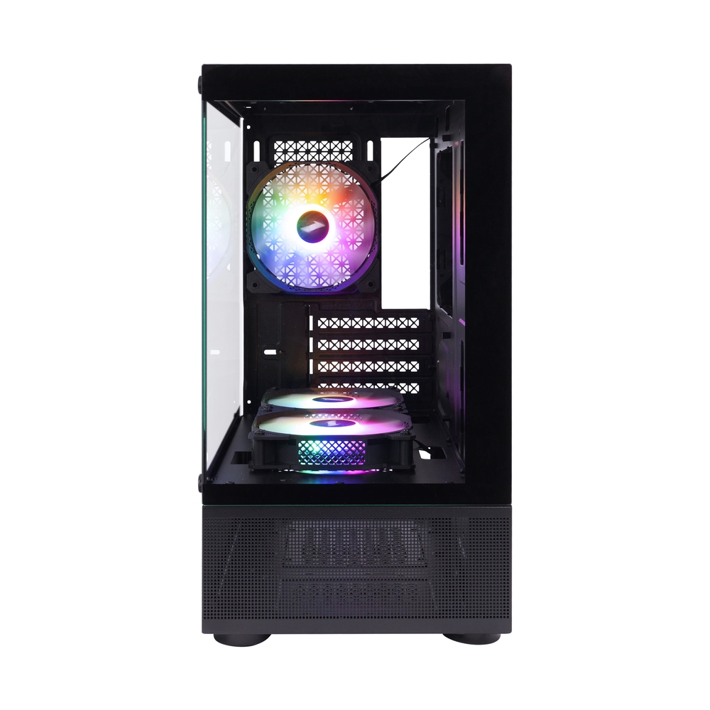 Корпус 1STPLAYER MIKU Mi2-A ARGB черного цвета в форм-факторе Mini-Tower подходит для сборки ПК на платформах Micro-ATX, Mini-ITX. Модель идет с 3 вентиляторами: 2 спереди и 1 сзади для быстрого отвода тепла. Сетчатая передняя панель обеспечивает эффективный продув. На передней панели устройства есть USB 3.1, USB 2.0, аудио разъемы и кнопки управления. Для эстетики предусмотрена ARGB подсветка вентиляторов и боковая стеклянная панель.