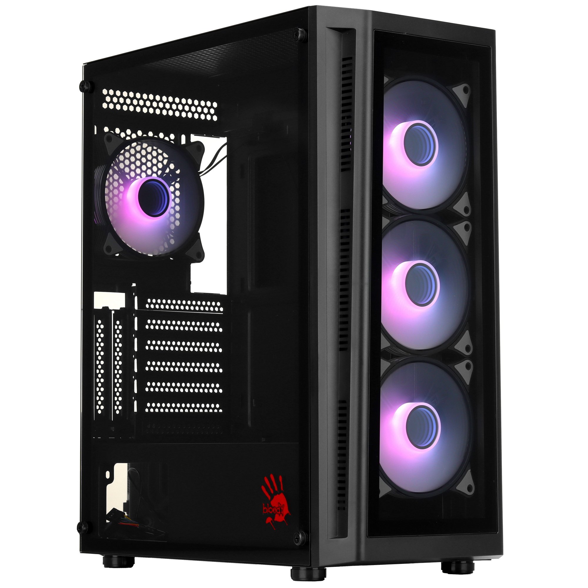 Корпус A4Tech Bloody BD-CC120F позиционируется как решение для постройки игрового системного блока и предполагает установку материнской платы в вертикальном положении. Особенностью модели является наличие большого прозрачного окна из закаленного стекла на боковой панели. Благодаря окну вам удобно будет снаружи наблюдать за функционированием компонентов геймерского ПК.