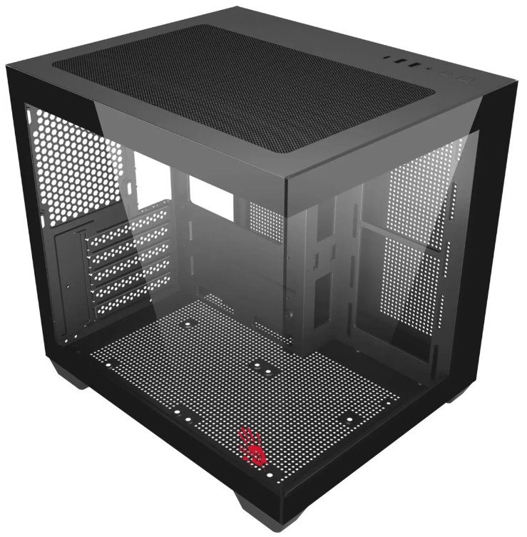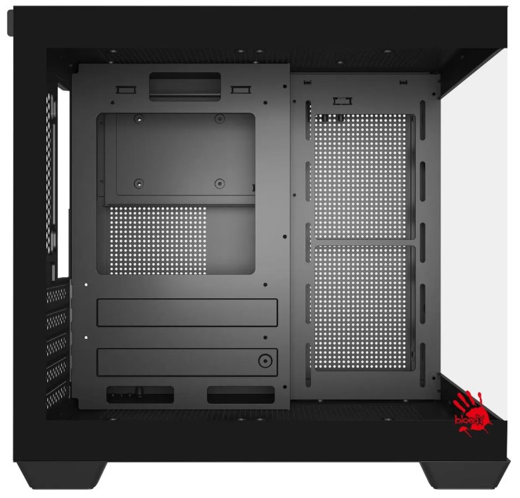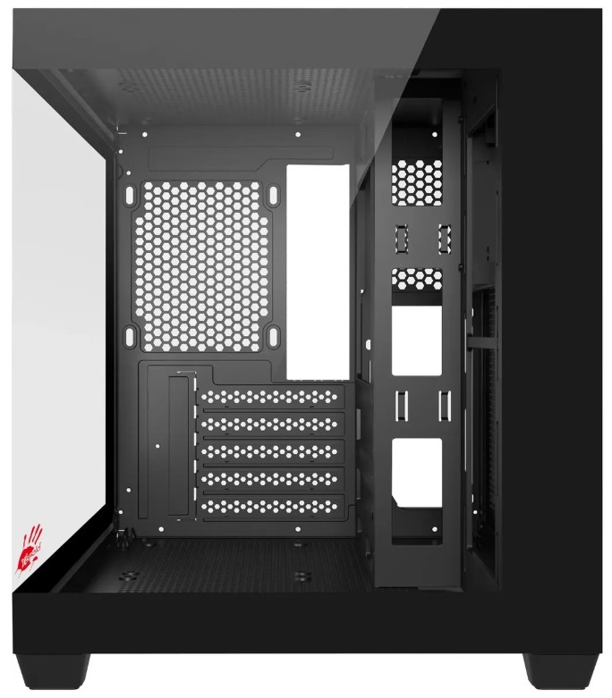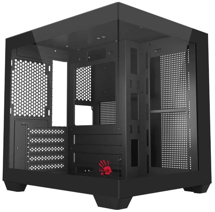 Корпус A4Tech Bloody представлен в типоразмере Mini-Tower и обладает габаритами 333x275x323 мм, благодаря которым в нем можно разместить в вертикальном положении материнскую плату форм-фактора mATX или mini-ITX. Для сборки компьютера в этом корпусе может использоваться видеокарта длиной до 325 мм, процессорный кулер высотой до 155 мм и блок питания длиной до 160 мм. Чтобы вы могли увидеть всю сборку без необходимости снятия стенки, боковая панель корпуса A4Tech Bloody выполнена из прозрачного закаленного стекла.