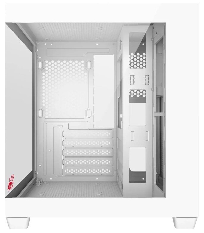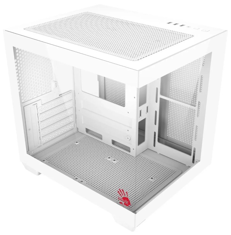 Корпус A4Tech Bloody представлен в типоразмере Mini-Tower и обладает габаритами 333x275x323 мм, благодаря которым в нем можно разместить в вертикальном положении материнскую плату форм-фактора mATX или mini-ITX. Для сборки компьютера в этом корпусе может использоваться видеокарта длиной до 325 мм, процессорный кулер высотой до 155 мм и блок питания длиной до 160 мм. Чтобы вы могли увидеть всю сборку без необходимости снятия стенки, боковая панель корпуса A4Tech Bloody выполнена из прозрачного закаленного стекла.