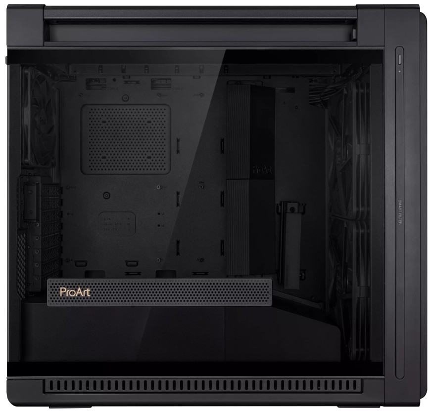 ProArt PA602 выполнен в классическом чёрном цвете. Размеры составляют 593 x 560 x 245 мм. Корпус предназначен для сборки систем на базе материнских плат форматов EATX/ATX/Micro-ATX/Mini-ITX/DTX/Mini-DTX.