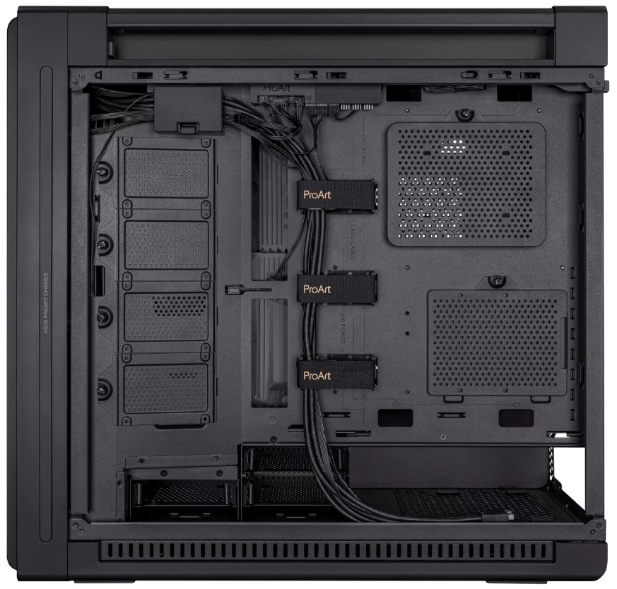 ASUS ProArt PA602 оснащён 8+2 слотами расширения. Внутри предусмотрены четыре комбинированных места для установки накопителей форматов 2,5 или 3,5 дюйма, а также четыре дополнительных места для накопителей формата 2,5 дюйма. Корпус поддерживает установку видеокарт длиной до 440 мм, процессорных кулеров высотой до 185 мм, а также блоков питания длиной до 190 мм. Для установки блока питания корпус разбирать не требуется — он размещается на специальном выдвижном лотке.