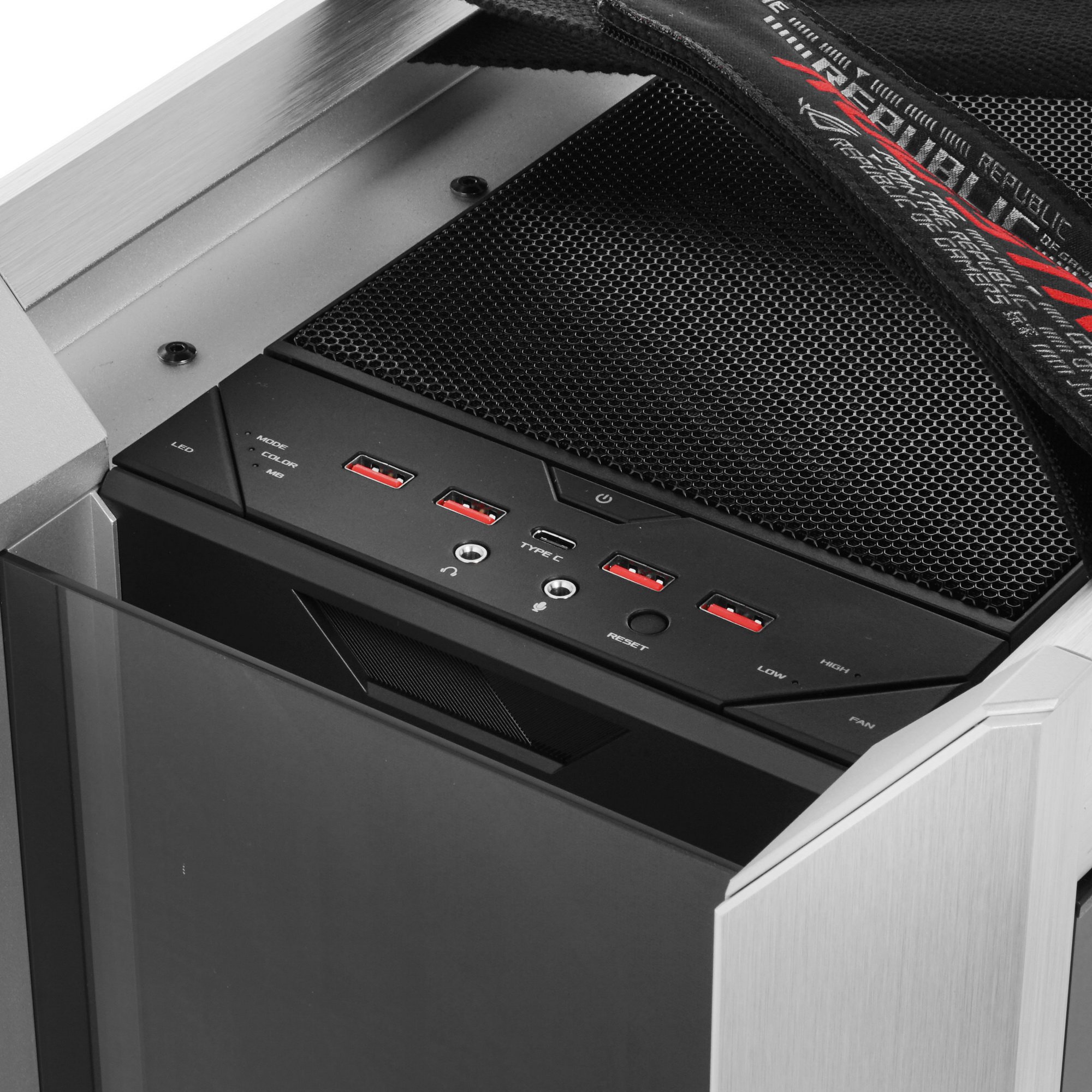 В среднеразмерном сером корпусе ASUS ROG Strix Helios GX601 White Edition [90DC0023-B39000] можно уместить огромное количество игровых компонентов. Он создан из алюминия, стали, пластика и закаленного стекла. Обе стороны корпуса прозрачные, через них видно ARGB-подсветку, как и через фронтальную панель. Управлять ею можно с использованием кнопки или приложения ASUS AURA.