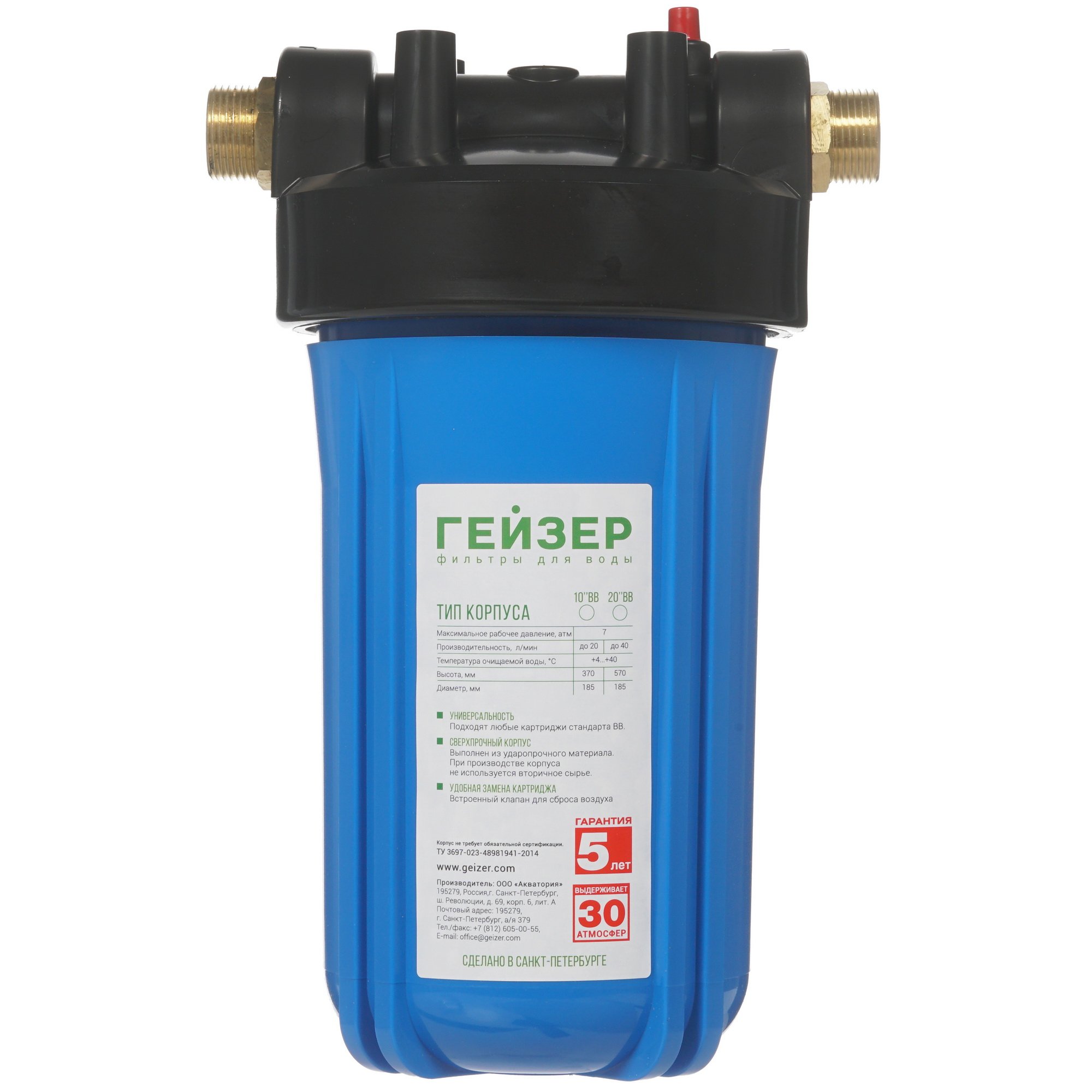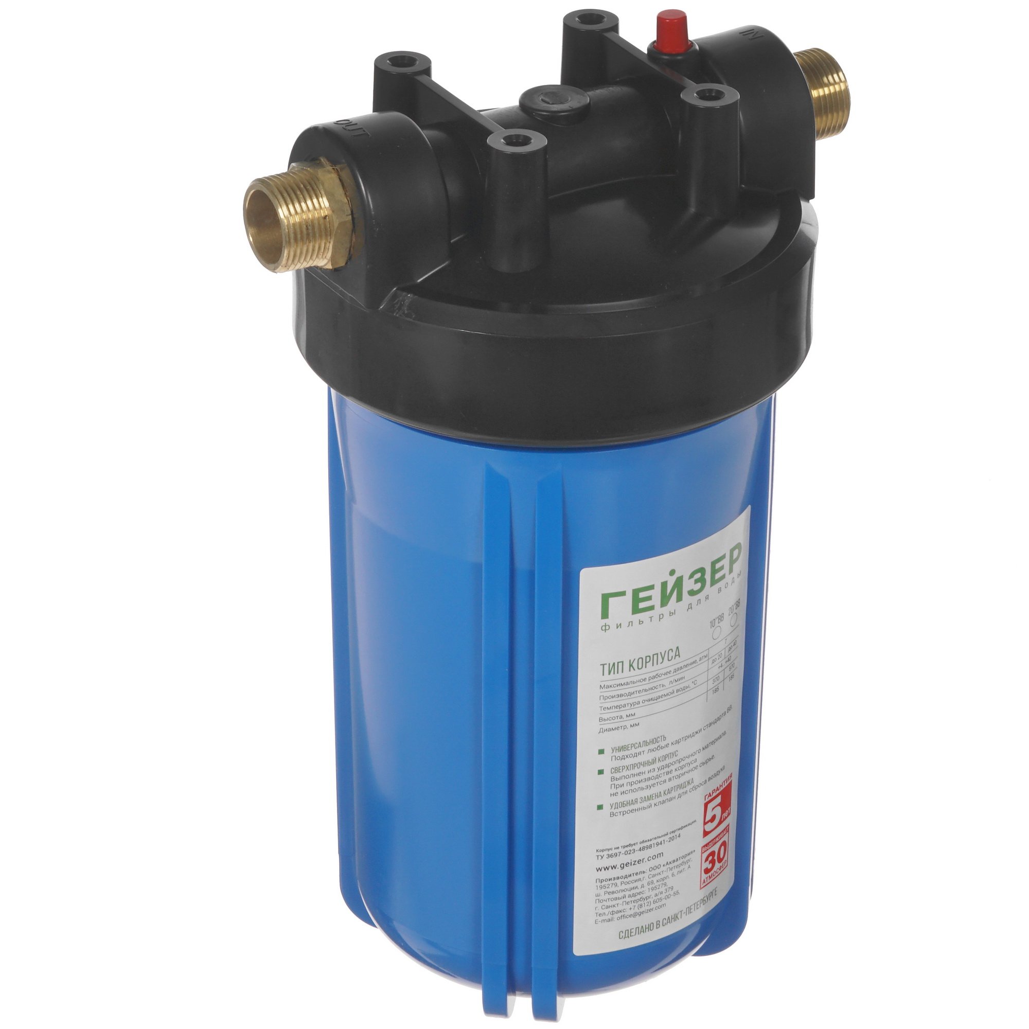 Корпус для магистрального фильтра Гейзер ВВ 10"x1" рассчитан на установку в систему холодного водоснабжения и предусматривает совместное функционирование с фильтрующим элементом для механической очистки воды от различных примесей. Он соответствует типоразмеру Big Blue 10. Данная модель отличается допустимым давлением 7 атм и скоростью фильтрации в пределах 20 л/мин. Корпус изготовлен на основе прочного пластика, а верхняя съемная крышка выполнена из полипропилена и оборудована устойчивыми к появлению коррозии латунными штуцерами. В комплекте с Гейзер ВВ поставляются необходимые принадлежности для удобного монтажа.