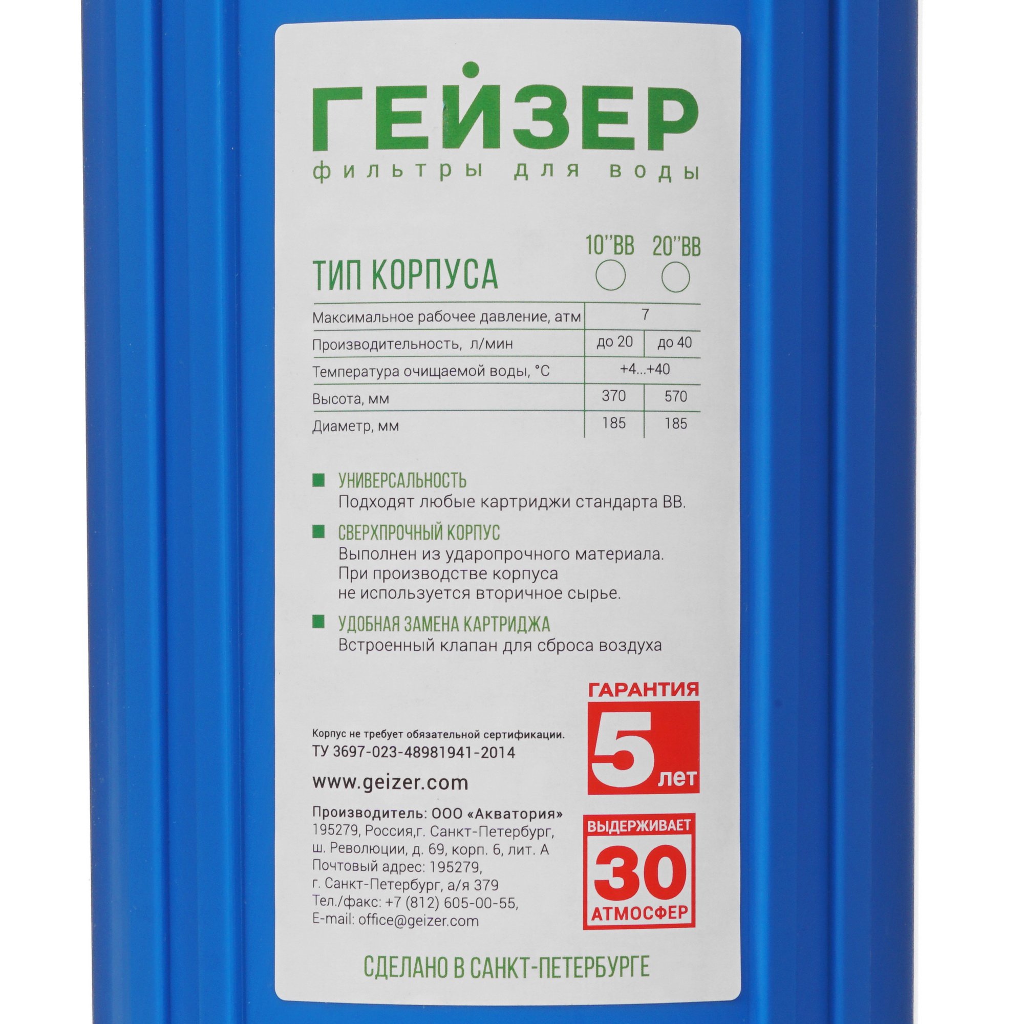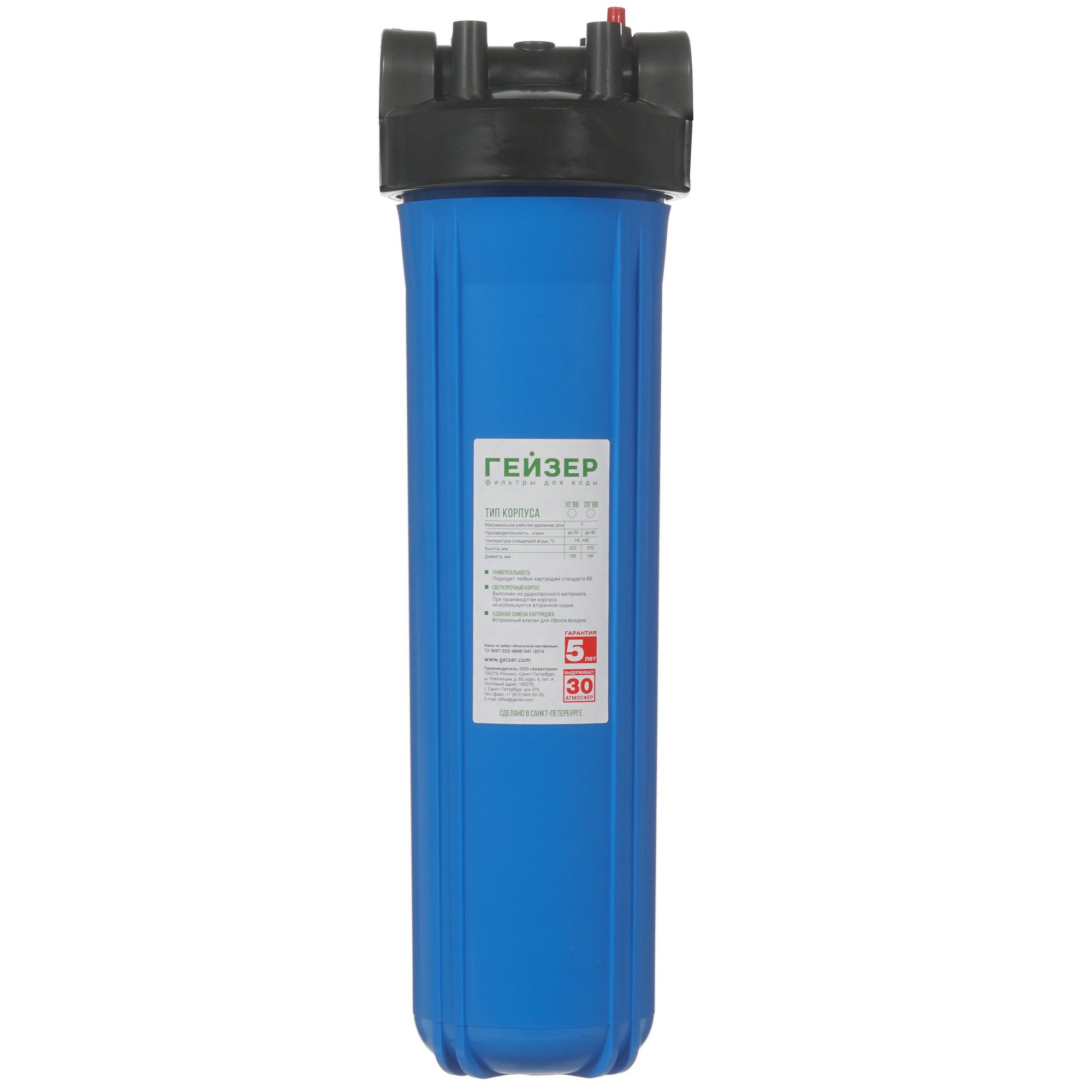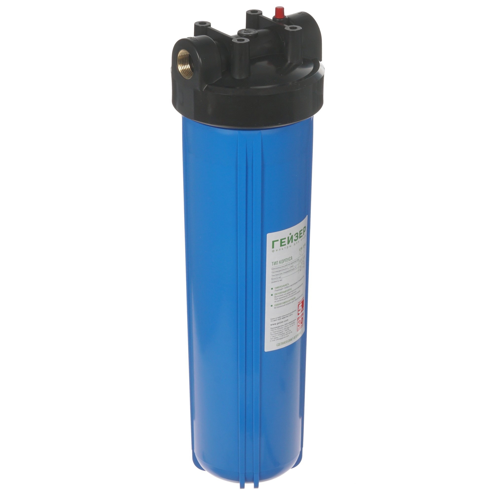 Корпус для магистрального фильтра Гейзер ВВ 20" 50716 выполнен в типоразмере Big Blue 20 и предусматривает совместное функционирование с фильтрующим элементом для механической очистки воды в системе холодного водоснабжения. Данная модель отличается допустимым давлением 7 атм и скоростью фильтрации в пределах 40 л/мин. К функциональным особенностям Гейзер ВВ 20" 50716 относится встроенный клапан сброса давления. В качестве материала применяется прочный и устойчивый к износу пластик. В конструкции съемной крышки предусмотрены встроенные латунные штуцеры с резьбовым соединением.