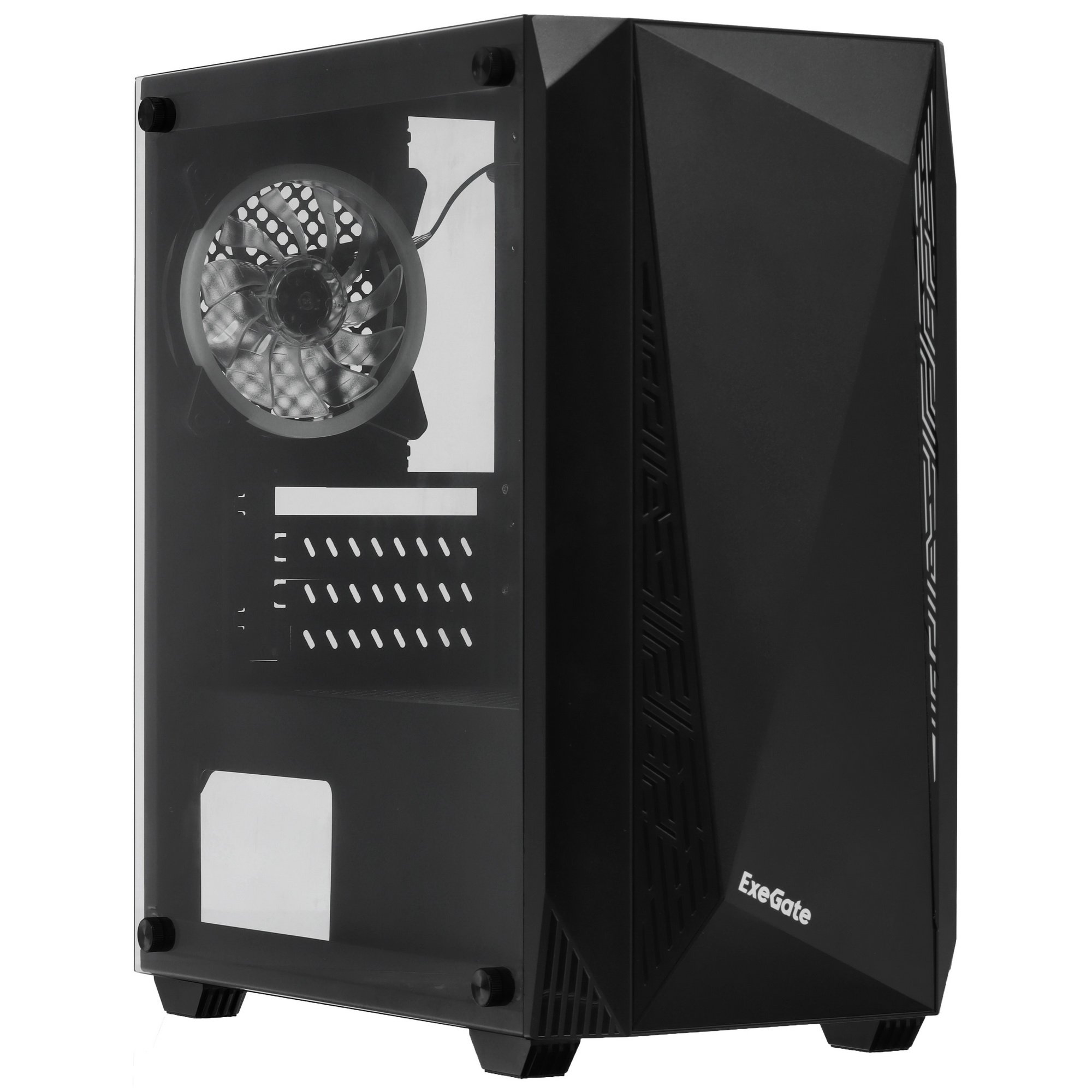 Компьютерный корпус Minitower ExeGate EX294384RUS Mistery R2 (mATX, без БП, 2*USB+1*USB 3.0, аудио, черный, 1 вент. 12см с RGb подсветкой и полоса на передней панели, боковая панель - закаленное стекло)