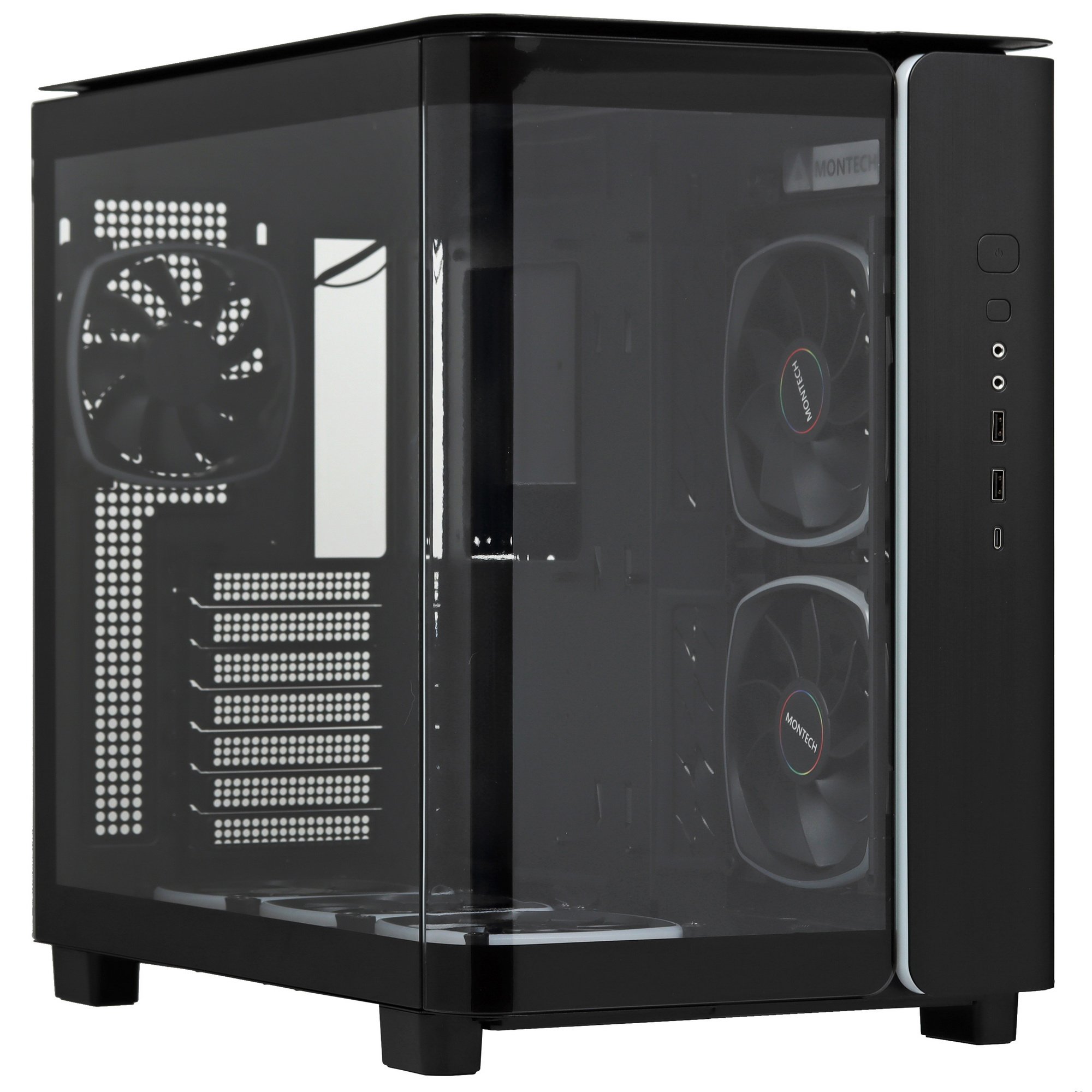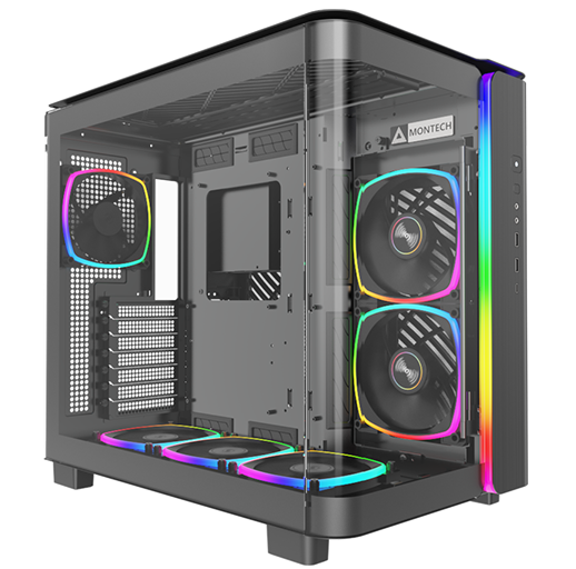 Корпус Montech KING 95 PRO подходит для сборки мощного игрового компьютера или производительного универсального ПК. Главные конструктивные особенности модели – изменяемое расположение блока питания и регулируемый кронштейн для вентиляторов. Фронтальная и боковые панели выполнены из 4-миллиметрового закаленного стекла промышленного класса, а стык между ними оформлен закруглением. Украшение устройства – многоцветная подсветка лицевой части и корпусных вентиляторов.