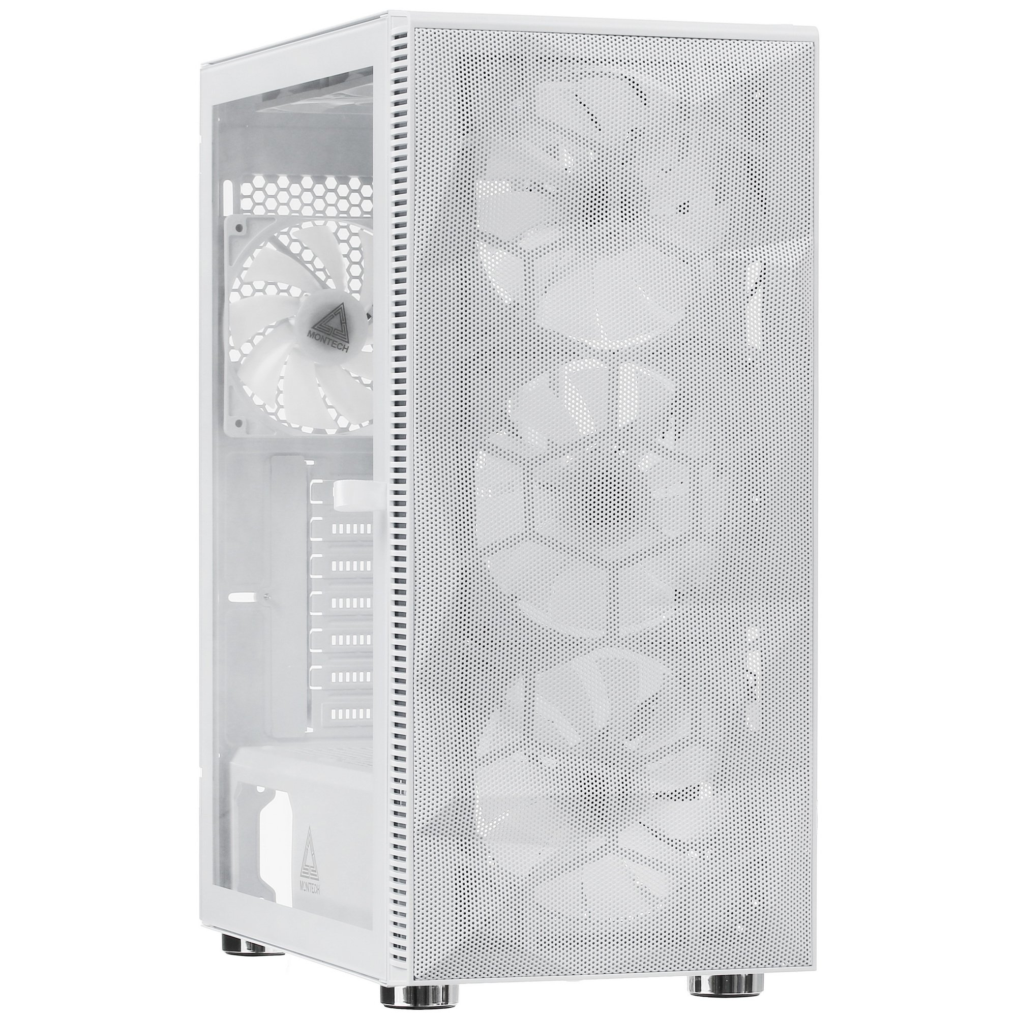 Корпус MONTECH X3 MESH объединит внутри все необходимые для офисной работы компоненты. При этом он выглядит достаточно необычно за счет белой расцветки и 6 вентиляторов с разноцветной подсветкой, которую видно через сетчатую фронтальную панель. В корпусе MONTECH X3 MESH вертикально получится разместить материнскую плату типа Micro-ATX, Mini-ITX или Standard-ATX. Длина видеокарты может составлять до 30.5 см. Боковые панели модели фиксируются на петли и открываются как дверцы для того, чтобы пользователь быстро получал доступ ко внутренним компонентам. Это упрощает сборку и уход за содержимым ПК.