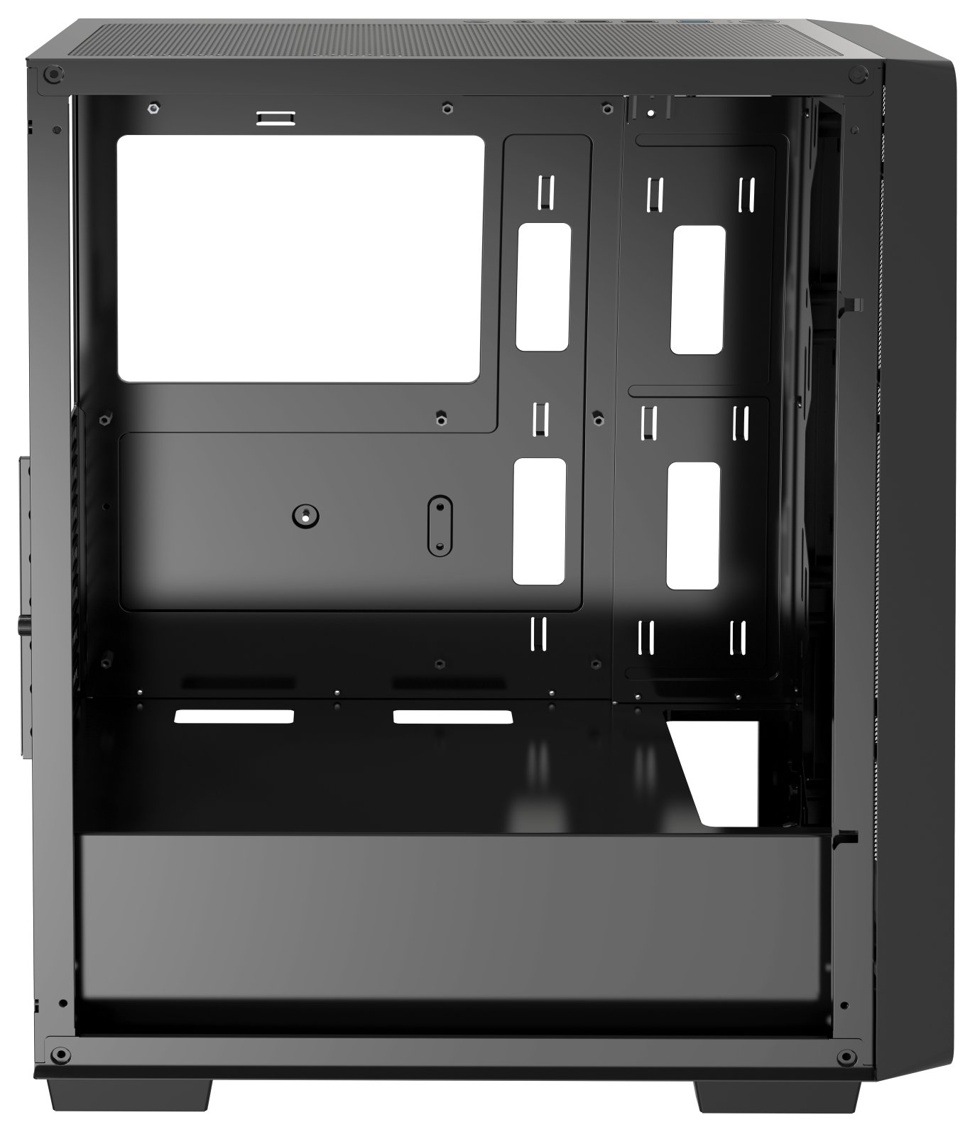 Корпус Ocypus Gamma C60 подходит для сборки игрового компьютера. Слева есть смотровое окно из устойчивого к сколам и повреждениям закаленного стекла. Металлическая сетка на фронтальной панели обеспечивает забор воздуха для исправной работы вентилятора и охлаждения компонентов ПК. Есть пылевой фильтр для меньшего загрязнения компонентов ПК, зазоры в корпусе для прокладки кабелей за задней стенкой, вырез для кулера.