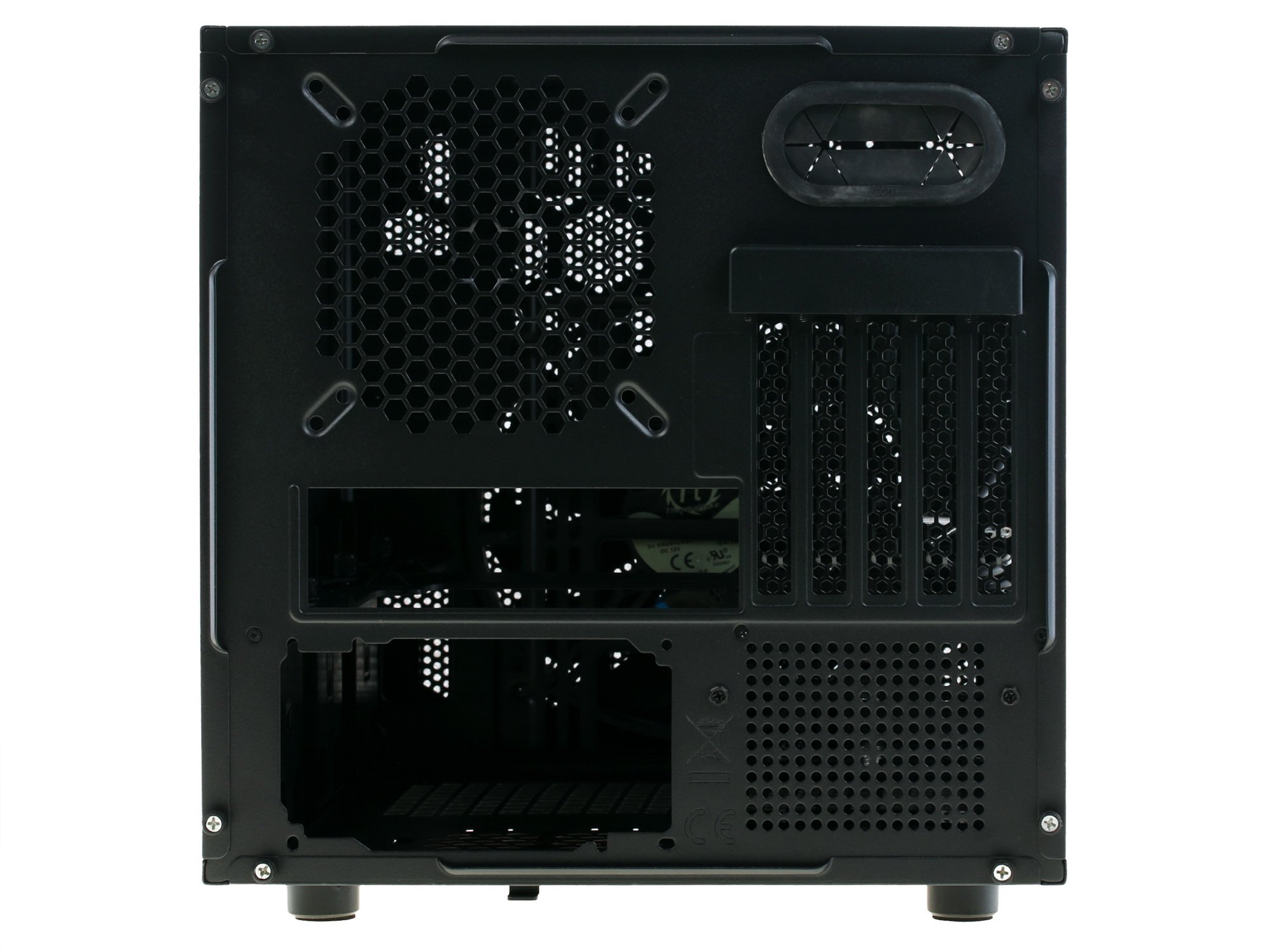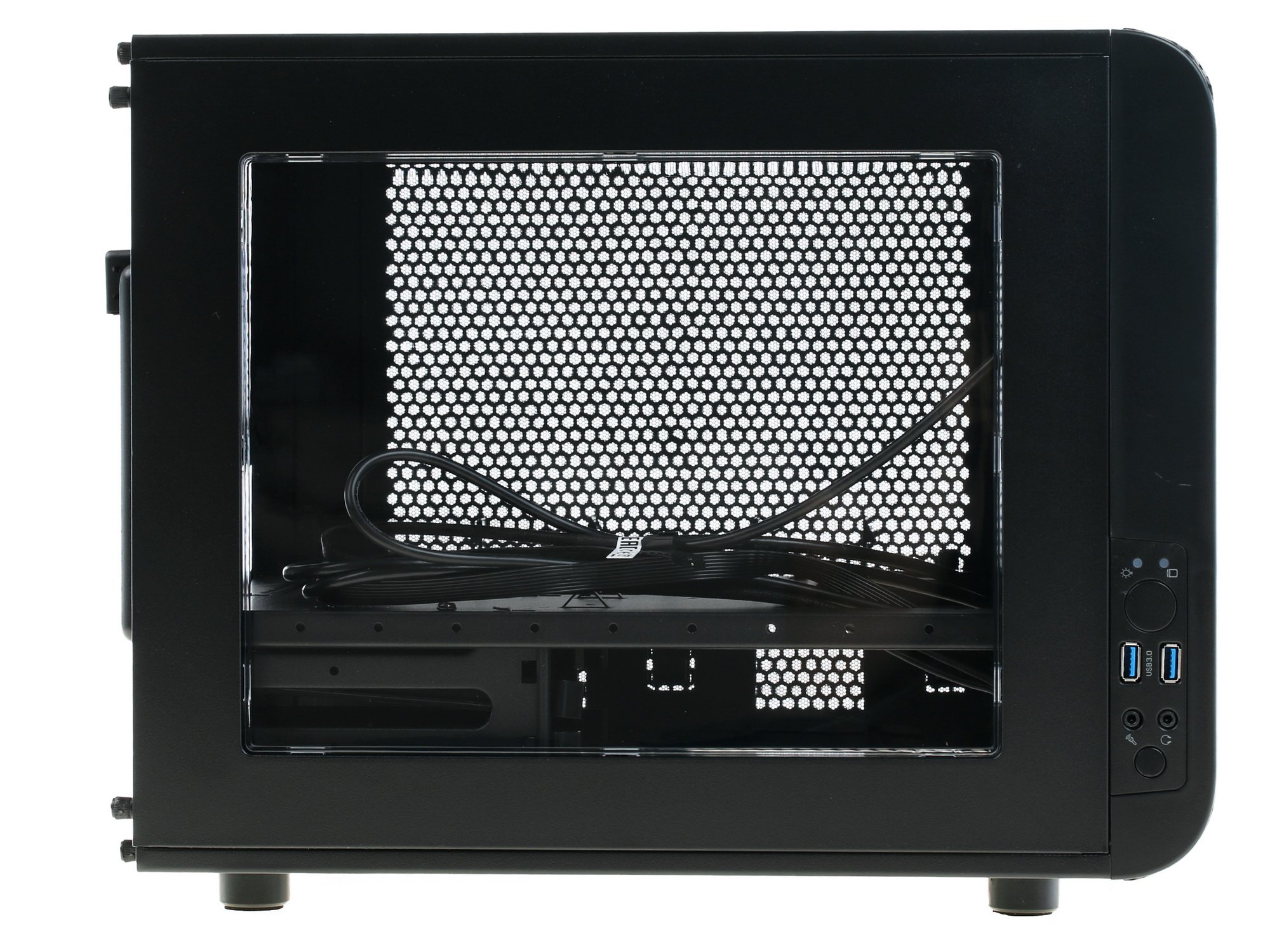Корзины накопителей расположены вдоль корпуса, а блок питания устанавливается в нижней части. Данное комплектующее изделие оснащено пятью слотами расширения и тремя скрытыми отсеками 3.5" , совместимыми с устройствами 2.5". Допускается установка видеокарты длиной до 35 см и кулера высотой до 18.5 см.