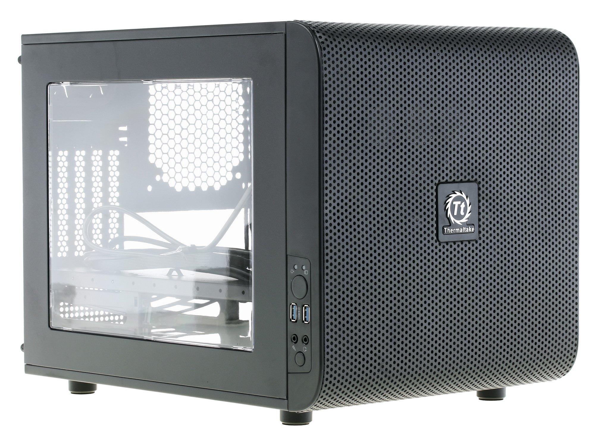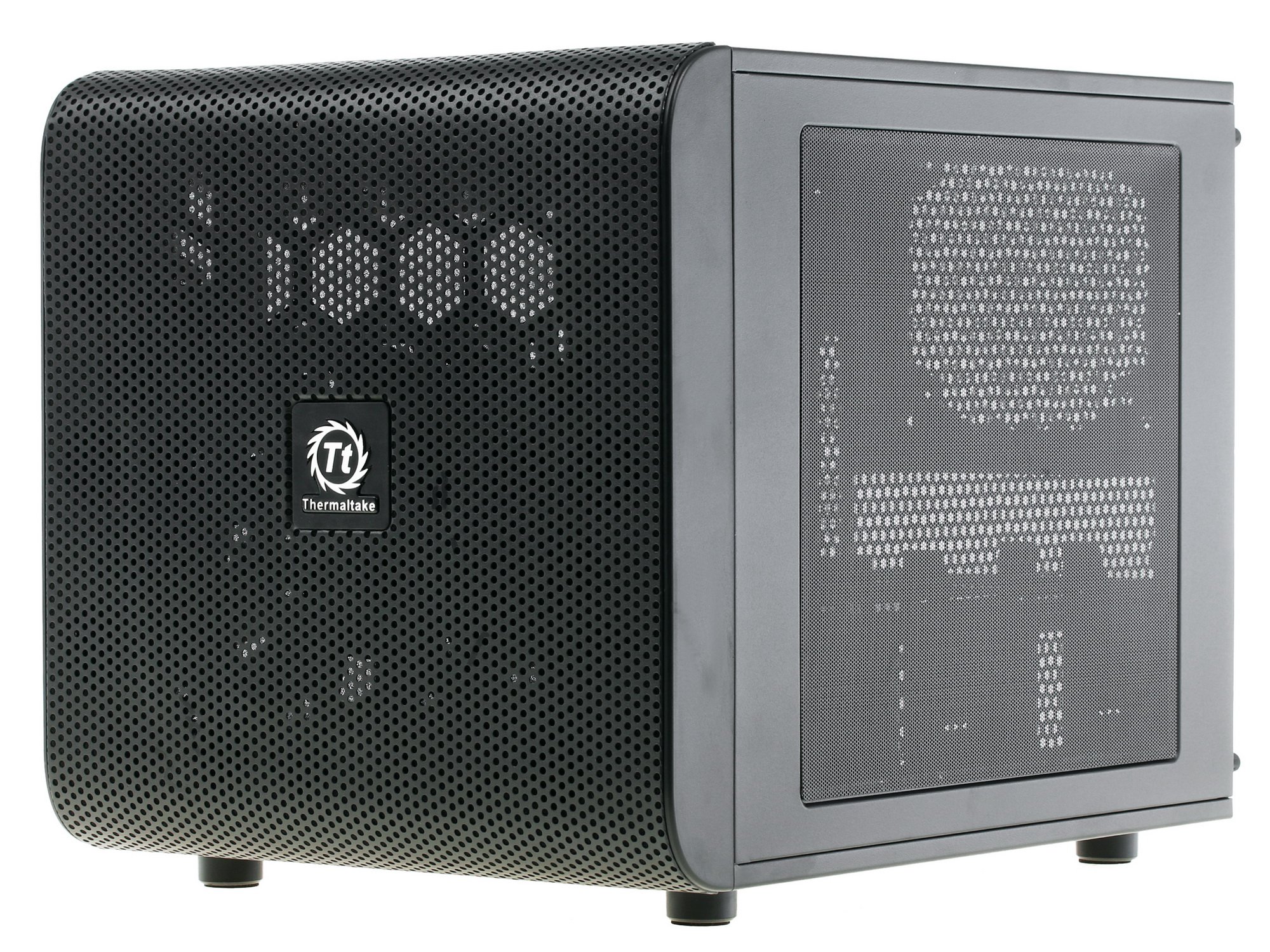 Корпус Thermaltake Core V21 стальной представлен в необычном дизайне в виде черного куба. Данная модель с типоразмером MicroTower предназначается для оснащения игровых компьютеров стандарта MicroATX. Предусматривается наличие большого бокового окна. Корпус весит 6.5 кг, имеет габариты 32x42.4x33.6 см и поставляется с набором крепежных винтов, кабельными стяжками и сеткой.