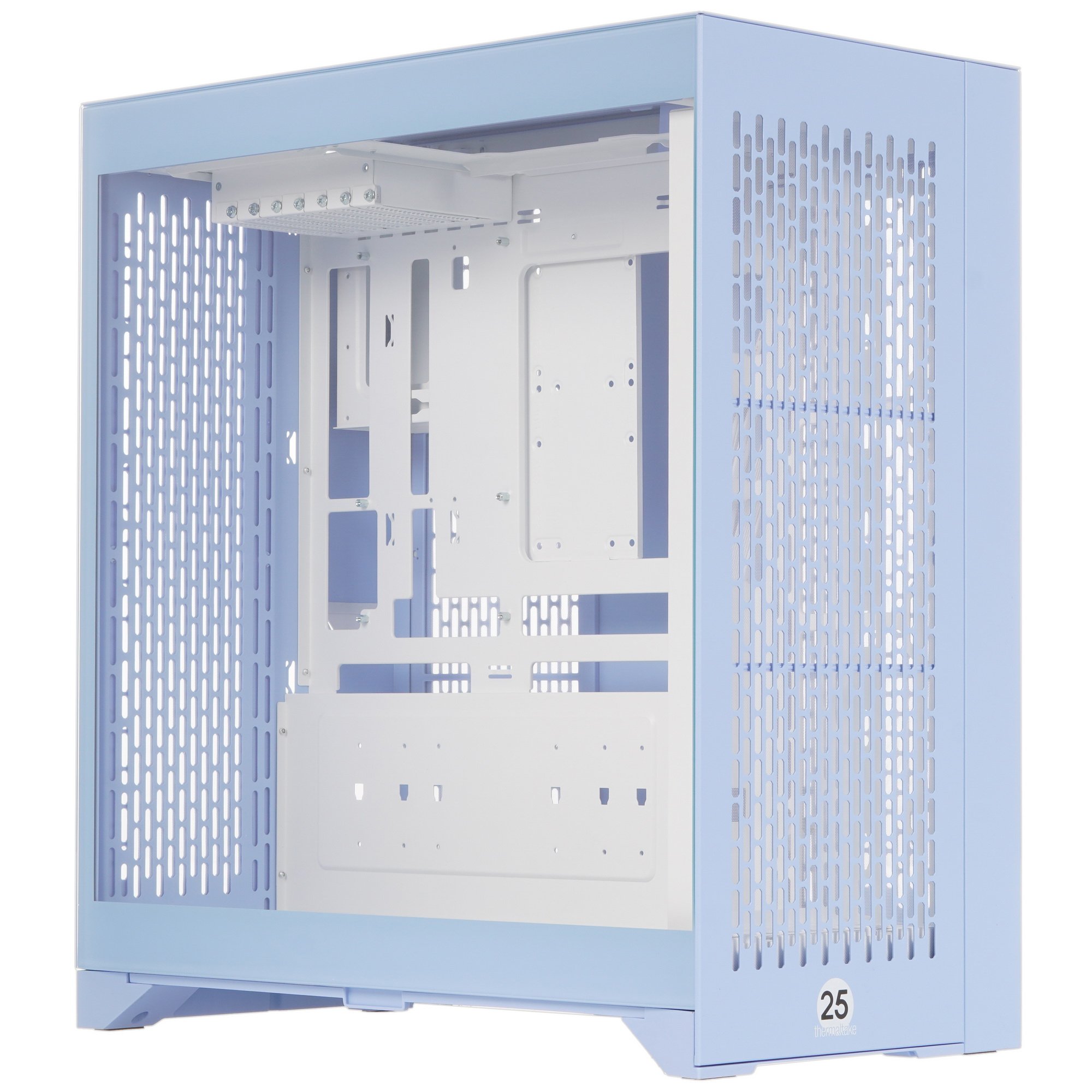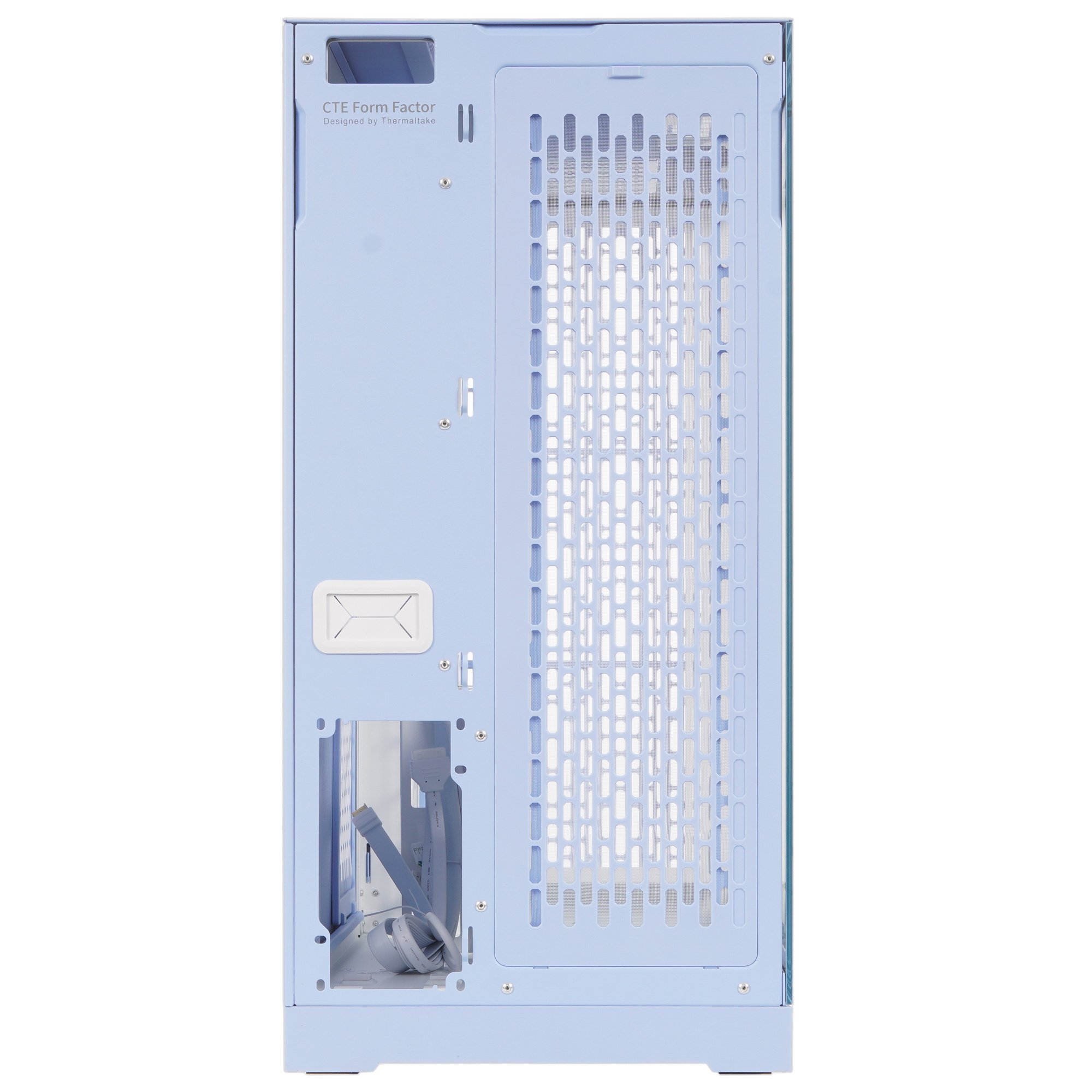 Корпус Thermaltake CTE E660 MX Hydrangea Blue – двухкамерная модель форм-фактора Mid-Tower, которая представлена в голубом цвете. Видеокарту в этот корпус можно установить в трех положениях. Графический ускоритель можно разместить горизонтально при помощи специального кронштейна и подключить его к материнской плате при помощи райзера. Также видеокарту можно расположить вертикально, с прямым подключением к материнской плате. Третий вариант размещения графического ускорителя – вертикально лицом к пользователю и параллельно материнской плате. Для такого варианта подключения необходим специальный кронштейн и райзер.
