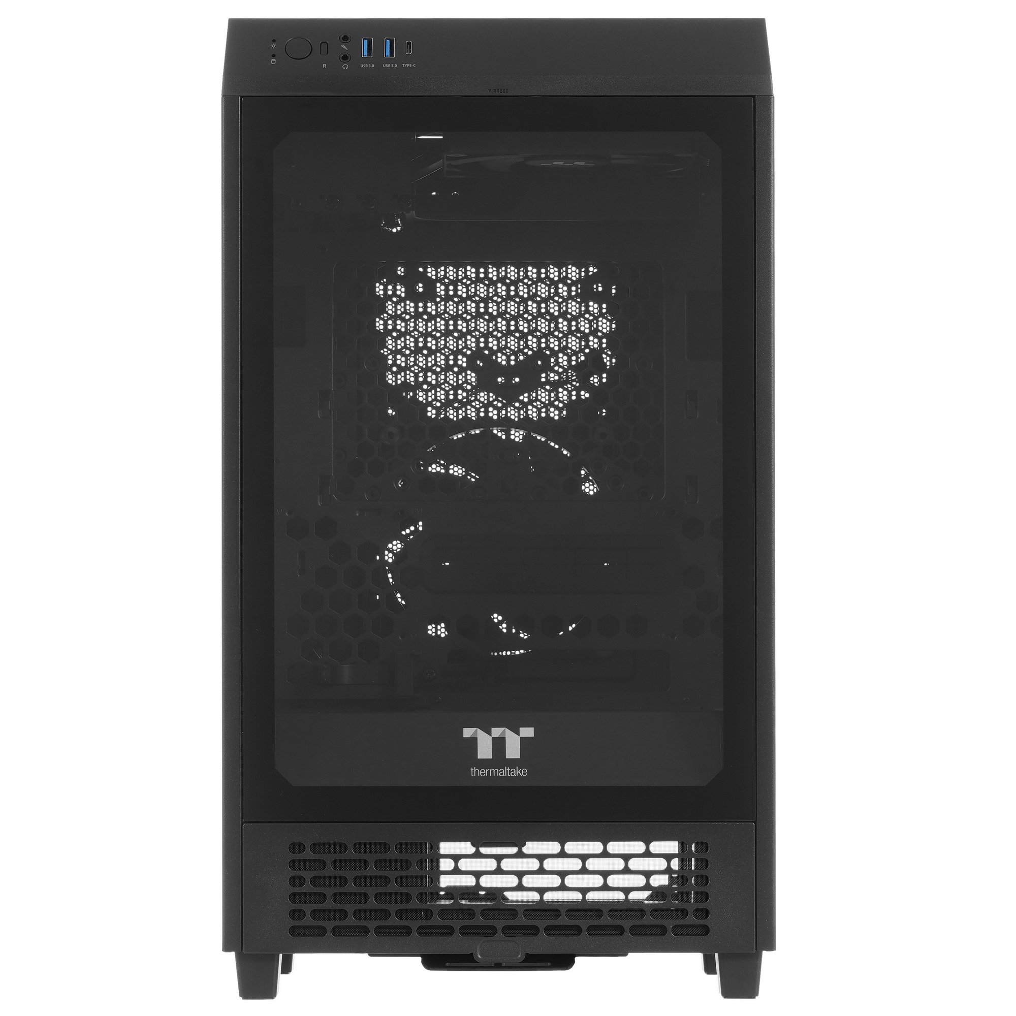 Корпус Thermaltake The Tower 200 оснащен 2 вентиляторами диаметром 140 мм каждый. Поддерживается установка боковых, верхних, тыловых и нижних вентиляторов, за счет чего будет соблюдаться оптимальная температура нагрева всех элементов ПК. Дополнительно можно установить систему жидкостного охлаждения. Это повысит производительность и снизит уровень шума при нагрузках. На передней панели размещены разъемы 3.5 мм jack, USB 3.2 Gen1 Type-A, USB 3.2 Gen2 Type-C. Съемные пылевые фильтры предупреждают внутренние загрязнения ПК.